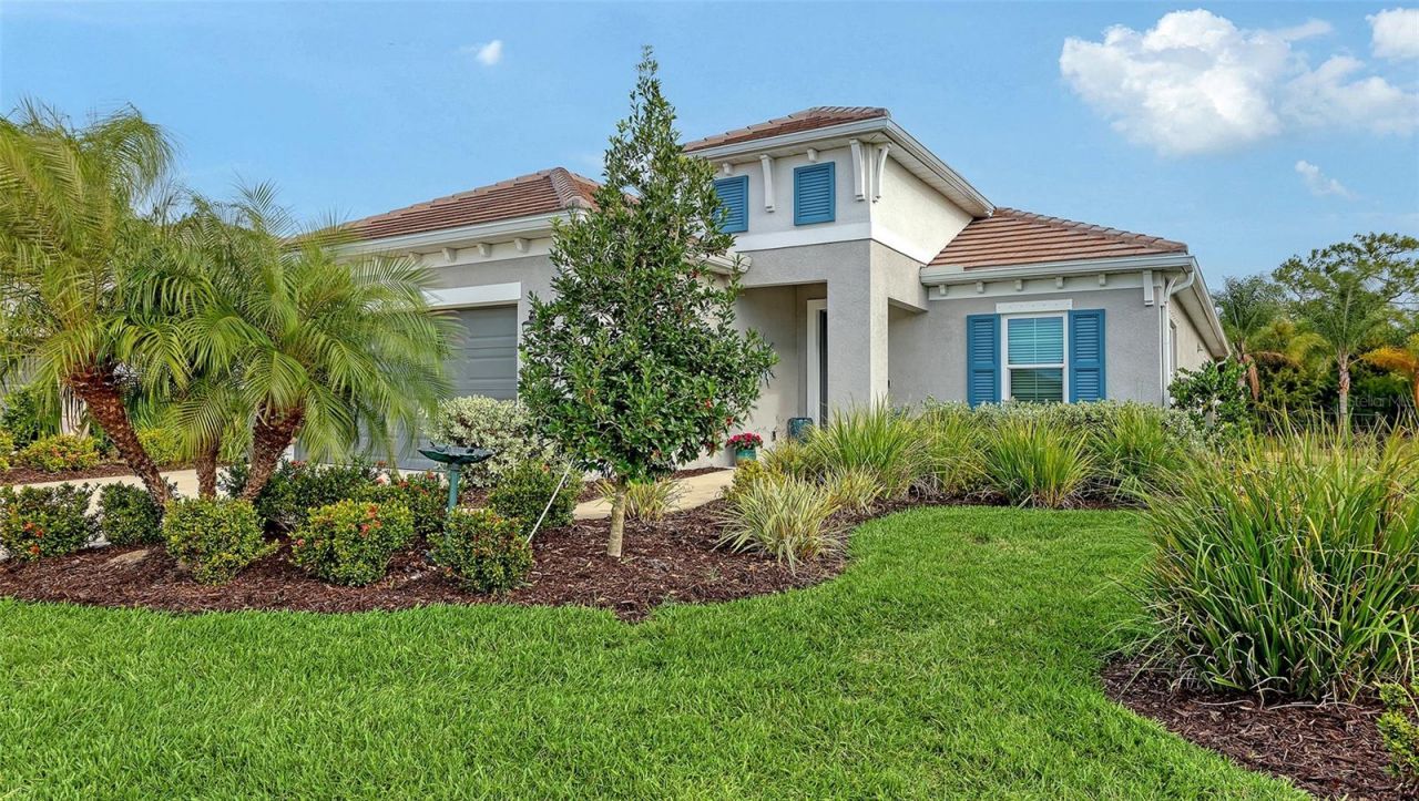 Better than new in Grand Park! A highly upgraded White Star floor plan by Neal Communities is ready for the most discerning buyers. It provides 2,064 sq. ft of luxury finishes, privacy and well thought out functionality in a light-filled open floor plan. Impact glass windows, roll-down hurricane shutter for the sliders and a ring doorbell add the security you are looking for. A whole-house water filtration and water softening system have been added. A large, screened lanai with custom pet door leads to the wrought iron fenced private yard. Inside, you'll find elegant silver/crystal contemporary light fixtures, whitewash ceramic wood-look plank flooring throughout, neutral paint color, four ceiling fans with lights, and tray ceilings in the foyer, great room and primary bedroom. The chef's kitchen includes a large quartz covered island with pendant lighting and breakfast bar, white linen 36 upper cabinets with crown molding, quartz counter tops, soft close doors and drawers, under-cabinet lighting, and tile backsplash. The stainless appliances include a gas stove (preferred by chefs), French-door refrigerator, dishwasher and microwave. Add to that a butler's pantry to keep the chef organized and you're ready to entertain in style! The primary bedroom is located in the rear of the house for privacy and includes two walk-in closets and an ensuite bathroom. A handheld shower head and heated bidet toilet seat add a touch of luxury. The guest bedrooms are in the front of the house with a guest bath with tub between them. A spacious den/office with double doors and a laundry room featuring an LG steam turbo washer/dryer with laundry sink complete the picture. The extended garage has an insulated garage door plus attic access with aluminum stairs/ladder. The amenity center has two resort-style pools, fitness center, clubhouse, pickle ball and tennis courts, playground and dog park. Grand Park is conveniently located just East of I-75 and a short distance to Siesta Key Beach and downtown Sarasota with its arts venues and multiple resturants.