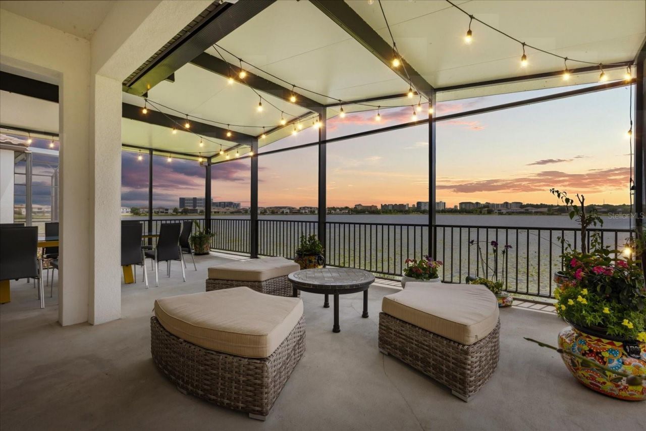 Waterfront living in the gated community of Ruby Lake in highly desirable 32836. This home sits on the shores of Lake Ruby with sweeping water views and the rare opportunity to enjoy both sunrise and sunset from your own backyard. A large screened-in covered patio and expansive sliding glass doors create seamless indoor-outdoor living, perfect for relaxing evenings or entertaining with a view. Inside, the open-concept layout connects the kitchen, living, and dining areas with a breakfast nook, bar seating, and a dedicated office or flex space, creating a comfortable and inviting flow throughout the home. The kitchen features natural gas cooking and built-in ovens, ideal for everyday living and hosting. The downstairs primary suite overlooks the water and offers a peaceful retreat with a spacious bath featuring dual vanities, a walk-in shower, and a large walk-in closet. A second bedroom downstairs is split from the primary with its own ensuite, while upstairs features a third bedroom with a full bath and a large loft, offering flexible space for guests or additional living. All bedrooms include walk-in closets. Additional features include a dedicated laundry room off the garage, concrete block construction, and a tile roof. Ruby Lake offers resort-style amenities including a community pool, fitness center, tennis courts, and a private lakefront viewing dock. Conveniently located near Disney Springs, Restaurant Row, Universal, International Drive, Orlando International Airport, and major roadways, this home offers a rare combination of lifestyle, comfort, and convenience in one of Orlando's most sought-after locations.