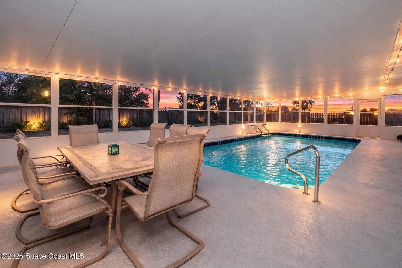 Welcome to this beautifully updated pool home in Merritt Island Florida, just minutes from the Indian River and a short drive to Cocoa Beach. This 3 bedroom plus office or bonus room, 2 bathroom home has been renovated and is move in ready. Updates include a newer roof, updated plumbing and electrical, and all new impact windows for efficiency and storm protection. The insulated garage has air conditioning and epoxy flooring, ideal for a gym or workshop. A rare indoor heated pool, fully resurfaced and heated by solar or gas, offers year round enjoyment. Tile flooring runs throughout with an updated kitchen and renovated baths. No HOA allows flexibility for short term rental or primary living. Close to beaches, Port Canaveral, Kennedy Space Center, shopping, dining, and an easy drive to Orlando.