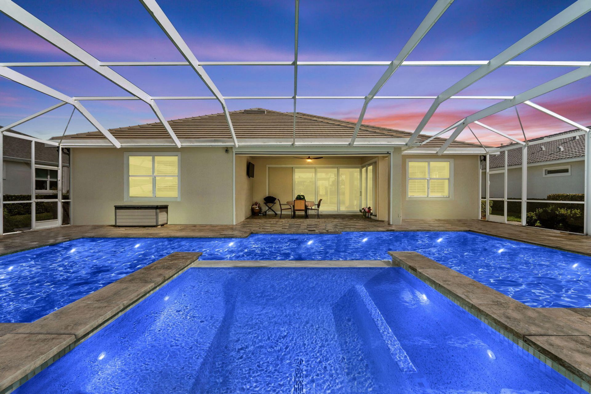 Discover this Magnificent Waterfront Pool Home in Del Webb at Tradition. Experience Elevated Florida Living in this exceptional 2019 CBS-Built Luxury Residence, perfectly situated on a premium- Waterfront Lot. Designed for both Elegance and Functionality, this Home has it ALL! Offering 3 Bedrooms, plus a private office/den, 3 full Bathrooms (including en-suite), and a 3-Car Garage. From the moment you arrive, the Paver driveway and entry set the tone for the quality and attention to detail found throughout. No expense was spared! Step inside this open and spacious layout, enhanced by Wood-Plank Tile flooring, all 8-foot doors, and custom Wainscoting in the main Living Area and Primary Suite, creating a refined yet inviting atmosphere. The Chefs Kitchen is a true showpiece, featuring 42-inch custom Cabinetry with organizers, Quartz Countertops, S/S KitchenAid Appliances on Natural Gas, a custom Hood vent, expansive Island with Bar seating, built-in Pantry, and a custom Wet Bar, perfect for entertaining. A separate Formal Dining Area provides an elegant setting for gatherings. Seamless indoor-outdoor living is achieved through a Zero Corner- sliding glass door that opens to your own private oasis, featuring a screened-in pool, and spa with a Travertine deck, overlooking tranquil Lake Views and breathtaking sunsets. The Spa and Pool features are app-controlled, including lighting and settings, Electric Roll Down shades and a New Pool heater and Pump for peace of mind. The Primary Suite offers a luxurious retreat with a custom built-in walk-in closet, Dual Vanities, and a walk-in Shower. Additional highlights include surround sound throughout the home, plantation shutters, a whole-home Generac Generator, epoxy-coated garage floors with custom cabinet storage, and a well-appointed laundry room. Del Webb at Tradition offers a resort-style, 55+ gated lifestyle with a private clubhouse, state-of-the-art fitness center, pickleball, tennis, bocce, swimming pools, and a full calendar of clubs and social activities. Located within Tradition, Residents enjoy access to a vibrant town center with shopping, dining, entertainment, medical facilities, walking trails, and year-round community events, all just minutes from home. This Waterfront Luxury Home delivers timeless design, modern convenience, and an unmatched lifestyle. Schedule your private showing today.