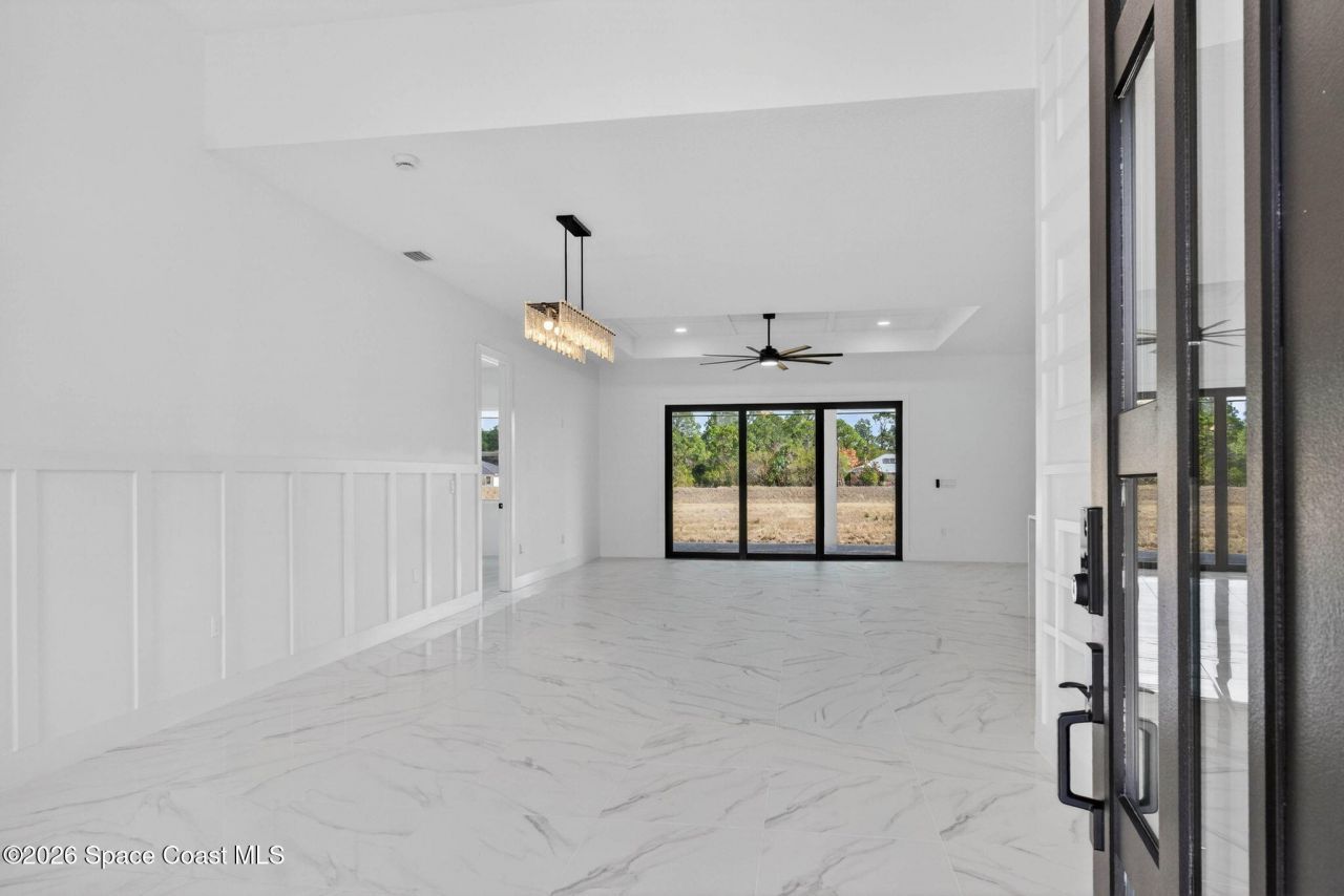 A rare canal-front new construction offering elevated modern living in Northwest Palm Bay. This 2,350 sq ft residence features true 10-foot ceilings with dramatic double tray details, creating a grand architectural presence. Designer 24 x 24 tile flooring flows seamlessly throughout, complementing the homes refined contemporary aesthetic.The gourmet kitchen features a wall oven and high end appliance package, ideal for entertaining and everyday living. The spa-inspired primary suite offers a freestanding soaking tub and spacious walk-in shower.Enjoy a covered patio overlooking the tranquil canal, providing privacy and a peaceful outdoor setting. Additional highlights include a luxury paver driveway, paver patio, smart lock system, Impact windows, and modern energy-efficient construction. A rare opportunity to own a thoughtfully designed canal-front residence built for comfort, prestige, and lasting value.