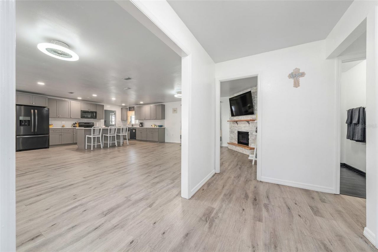 SELLER OFFERING UP TO $7,500 TOWARD BUYER'S CLOSING COSTS AND PREPAIDS WITH AN ACCEPTED OFFER!!!! This beautifully updated home with a newer roof for peace of mind rests on a .76-acre oak-shaded corner lot in a quiet, established neighborhood. Located within easy walking distance to downtown Kissimmee, Neocity, and the SunRail station, it offers both serenity and accessibility. NO HOA here, and you'll also enjoy effortless access to restaurants, shopping, public boat ramps, and the nearby bass-rich waters of Lake Toho. Inside, large windows fill the space with natural light, complementing a neutral color palette, updated lighting fixtures, and newly installed luxury vinyl plank flooring. The open living area is perfect for entertaining, featuring wide open spaces and a stacked stone fireplace that sets the tone for gatherings. Glass-inset French doors lead to a spacious screened Florida room with an in-ground spa, ideal for relaxing while overlooking the peaceful, tree-lined backyard. The recently updated kitchen is thoughtfully designed with Shaker-style cabinetry, a stainless farmhouse apron sink, recessed LED lighting, solid surface countertops, stainless steel appliances, and a center island that invites casual dining and conversation. The owner's suite offers a spa-inspired retreat with a marble-topped double vanity and a walk-in shower adorned with custom tilework and pebble-style flooring. Two additional guest rooms and an updated full guest bath provide comfort for visitors or a growing household. A dedicated laundry room with a front-load washer and dryer adds everyday convenience. Bring your toys as the oversized lot easily accommodates boats, RVs, and outdoor gear. A storage shed adds functionality, and mature landscaping enhances the sense of calm and privacy. This home delivers the peaceful feel of country living with all the conveniences of city life, making it a rare and inviting find in the heart of Kissimmee.