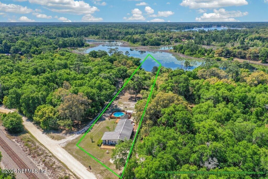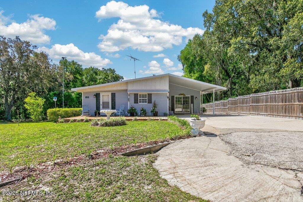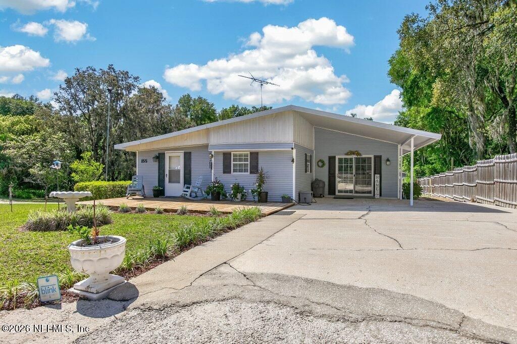 FINANCING AVAILABLE -- THIS IS NOT A CASH-ONLY SALE. Unlike many homes of this style and age that have been incorrectly marketed as cash-only, 155 Tompkins Road is financeable through select lenders. Don't let outdated assumptions limit your buyer pool -- conventional and specialty financing options exist for qualified buyers.Set beneath a canopy of ancient live oaks draped in Spanish moss, this 3-bedroom, 4-bathroom home with a dedicated office sits on 2.1 acres with 150 feet of lake frontage in the heart of Pomona Park -- one of Putnam County's most quietly coveted rural communities. With a metal roof overhead and room to breathe in every direction, this is the kind of property that doesn't come up often.Inside, the layout flows the way a home should. The oversized living room anchors the main living space with carpet, natural light, and plenty of room for the whole family. The dining area steps up with wainscoting, hardwood-look flooring, and a chandelier that sets the tone before you even reach the kitchen. That kitchen means business: white cabinetry, granite-look countertops, and a full suite of stainless LG appliances including a French door refrigerator, range, microwave, and dishwasher.The primary suite is private and spacious with a walk-in closet and its own en-suite bath. Two additional bedrooms, three more full bathrooms, and a dedicated office -- easily a 4th bedroom -- round out a floor plan that works for families, remote workers, or anyone tired of making compromises.Step outside and the value keeps building. The backyard is fenced and features an above-ground pool set into a custom wood deck -- a resort-style setup ready for Florida summers. Situated right by the pool is a fully equipped separate building housing the laundry and fourth bathroom, complete with electric, water, and air conditioning. This flex space could easily function as a private office, guest suite, or additional bedroom -- making this a potential 5-bedroom property depending on your needs. Multiple sheds on the property provide an abundance of storage, keeping everything organized and out of the way. The covered carport and front porch with rocking-chair space round out the outdoor package.Two wells and two septic systems give this property a level of infrastructure independence that's rare and genuinely valuable -- no water bills, no shared utilities, built to handle whatever you need.And then there's the waterfront. One hundred and fifty feet of lake frontage on 2.1 acres of land -- fish from your own shoreline, launch a kayak before coffee, or simply watch the sun set over the water from your own property. Pomona Park sits squarely in Florida's outdoor paradise -- the St. Johns River corridor. Dunns Creek State Park, 6,200 acres of hiking, kayaking, and pristine wilderness, is right in your own community. You're 8 miles to Crescent City, 16 miles to Palatka, under an hour to Gainesville, and 75 miles to Jacksonville.