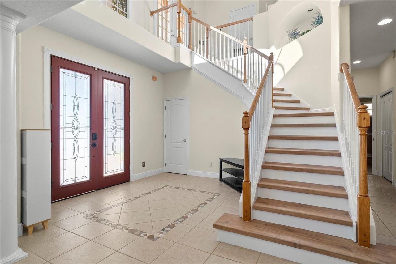One or more photo(s) has been virtually staged. Stunning Mediterranean-style pool home on a 1/2-acre lot in an exclusive gated executive community with lake access and scenic lake views. Dual sunrise and sunset balconies welcome you upon arrival. Inside, enjoy cathedral ceilings in the foyer and family room, high ceilings with indirect lighting in the formal living and dining rooms. The first-floor primary suite offers a private retreat with walk-in closets, double vanities, and jetted garden tub. All secondary bedrooms are oversized. Recently renovated kitchen, updated flooring throughout, and a newer tile roof add value and peace of mind. Outdoor living shines with a large heated screened-in pool, expansive deck, and fruit trees.