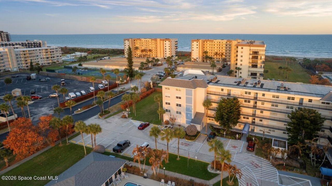 Enjoy panoramic views from this penthouse, end-unit condominium with a private wraparound balcony; perfect for breathtaking sunrises, stunning sunsets, and rocket launches. This move-in ready home features an open, light-filled floor plan and a chefs kitchen with newer KitchenAid appliances, designer granite countertops, and a breakfast bar. An oversized laundry room provides additional pantry storage.The spacious primary suite offers two large closets and an updated bath with double vanity. Recent updates include newer A/C, water heater (2023), and electrical panel (2025). The unit also includes a private single-car garage near the elevator, two additional parking spaces, and ample guest parking.This storm-ready concrete block building w/ hurricane shutters has completed exterior painting, new balcony railings, and concrete restoration. Community amenities include a heated pool, tennis & pickleball courts, clubhouse, vehicle wash area, and beautifully maintained grounds.