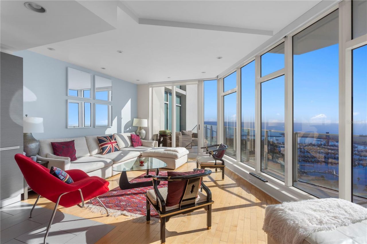 A rare opportunity to own one of only 10 coveted two-story 'A floor plans in the iconic Signature Place, one of downtown St. Petersburg's most architecturally striking towers. This residence offers a thoughtfully designed layout that blends sophisticated design with effortless livability.The main level welcomes you with a stunning open-concept living and kitchen space, perfectly framed by floor-to-ceiling glass walls showcasing sweeping views of the bay, marina, city skyline, and airport. The living areas are accented by warm hardwood flooring, creating a refined contrast to the home's modern lines. The designer kitchen features custom European cabinetry, quartz stone countertops, Thermador and Bosch appliances, ceramic tile flooring, and sleek modern finishes-ideal for both everyday living and elevated entertaining. Also located on the main level is a dedicated office/den, providing a flexible space for working from home or hosting guests.Upstairs, the private bedroom level offers a peaceful retreat, with two spacious bedrooms thoughtfully separated from the living areas below. The bedrooms feature plush carpeting, enhancing comfort and privacy, while the primary suite boasts expansive views, electric blinds, a generous walk-in closet, and a spa-inspired feel that complements the home's contemporary aesthetic.Step outside to over 500 square feet of private terrace space, where indoor-outdoor living comes to life-perfect for entertaining, enjoying waterfront sunsets, or even taking in the sights and sounds of a Rowdies game from the comfort of your own home.Signature Place enhances the lifestyle with resort-style amenities including a heated pool and spa, fitness center, party room, club room, and 24-hour front desk reception.Additional highlights include two secured parking spaces and one storage unit, offering both convenience and peace of mind. Located just steps from St. Petersburg's vibrant waterfront district-world-class dining, boutique shopping, the Dal? Museum, Mahaffey Theater, and Tropicana Field-this residence is more than a home.It's a lifestyle defined by elevated design, breathtaking views, and the energy of downtown living.