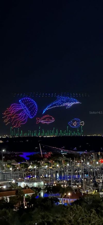 One or more photo(s) has been virtually staged. Spacious elegance. Walls of glass. Waterfront Balconies.This extraordinary residence is defined by light, scale, and jaw-dropping views. With two unobstructed waterfront balconies, the home overlooks Tampa Bay, The Pier, two marinas, the Saturday Morning Market, and the dynamic energy of Albert Whitted Airfield. A total of 36 floor-to-ceiling windows wrap the main living spaces, creating the feeling that every room is suspended above the water.A grand entry sets the tone, opening into an expansive layout designed to impress. The oversized primary suite offers a serene retreat with an enlarged, custom closet featuring adjustable shelving and a spa-inspired bath accented by custom-cut granite countertops and integrated soap dispensers.The guest suite is equally impressive-easily accommodating a king bed or dual twins with ample furniture-and is elevated further by its own private waterfront balcony, delivering an unforgettable guest experience.A stylish powder room adds a touch of playful sophistication with an LED color-changing faucet, a detail guaranteed to surprise and delight.The kitchen is a true statement piece. A dramatic granite waterfall island anchors the space, complemented by a full granite backsplash that extends seamlessly to the ceiling. The extra-wide countertop offers generous bar seating, while the custom-cut, leathered granite subtly sparkles as evening light washes across the room.The glass-wrapped dining area flows effortlessly into a spacious living room designed to accommodate an 85-inch or larger television, without sacrificing elegance. Kitchen, dining, and living spaces all open directly to the main balcony-creating a seamless indoor-outdoor experience framed by sweeping bay views. Two premium parking spaces and a convenient storage unit are also included.Residents enjoy full-service amenities including 24/7 concierge, a resort-style infinity pool surrounded by lush landscaping, private cabanas, outdoor grilling areas, refined social spaces, and a state-of-the-art fitness center.Step outside and into the heart of St. Petersburg, consistently ranked among the nation's most livable and walkable cities. From the 2.4-mile waterfront park and world-class museums to marinas, dining, shopping, and the iconic St. Pete Pier, everything that defines downtown living is just moments away.This is a rare opportunity to own a dramatically upgraded waterfront residence in one of downtown St. Petersburg's most iconic luxury towers.