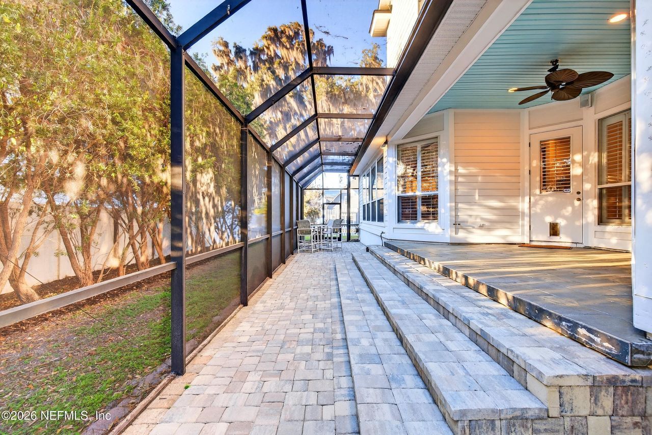 The spacious primary suite is conveniently located on the first floor. This private retreat features two generous walk-in closets, an oversized walk-in shower, and stunning dual-sided marble vanities. A guest bedroom and full bath are also located downstairs, offering flexibility for visitors. The kitchen is complete with granite countertops, a stone backsplash, a walk-in pantry, and 2022 stainless steel refrigerator and microwave. Wood flooring flows throughout the entire first floor, with replaced carpet upstairs, complemented by plantation shutters throughout the home and tile in all bathrooms. Upstairs, you'll find additional well-sized bedrooms, including a charming fifth bedroom featuring a Romeo balcony with peaceful lake view. Updates including a 2021 roof, 2023 water heater, 2023 exterior paint, and 2026 interior paint touch-ups, 10x50 screened patio and new pavers, both completed in 2025. Additional features include a wide-set, deep 3-car garage, 2 attics & 2 AC units.