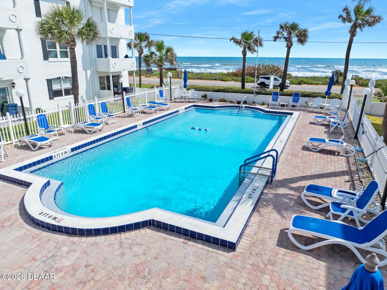 Experience refined coastal living in this 1,190 square foot, two-bedroom, two-bath residence, where a beautifully kept courtyard, resort-style pool, and Atlantic Ocean views create a truly captivating setting. Enjoy gentle sea breezes and abundant natural light from both the living area and private balcony, enhanced by a front storm door and updated HURRICANE-IMPACT SLIDING GLASS DOOR.The interior reflects timeless coastal sophistication. You will be surprised at how spacious this home feels with the large living/dining combo and the spacious bedrooms. Luxury vinyl plank flooring throughout the main living spaces offers coastal beauty and ease of care. Plantation shutters in the bedrooms add a tailored finish to this beautiful FULLY FURNISHED home!This condo boasts ample storage space with dual linen closets, a spacious utility closet, and a shared storage room located just across the hall. Set within an intimate 36-unit, three-story community, this residence provides a peaceful and private atmosphere while embracing an elevated beachside lifestyle. Significant improvements have been completed, including a 2022 HVAC system, 2024 water heater, and 2023 roof, complemented by completed structural engineer and SIRS studies, offering confidence and long-term value.Low HOA fees further enhance the appeal, and include water, sewer, trash, cable, internet, pool amenities, building maintenance, and pest control.Just 100 steps from your front door, the PRIVATE BEACH ACCESS leads to a tranquil, no-drive stretch of shoreline, ideal for leisurely walks and gorgeous beach days.A rare opportunity to enjoy timeless coastal elegance in a thoughtfully maintained ocean side community.