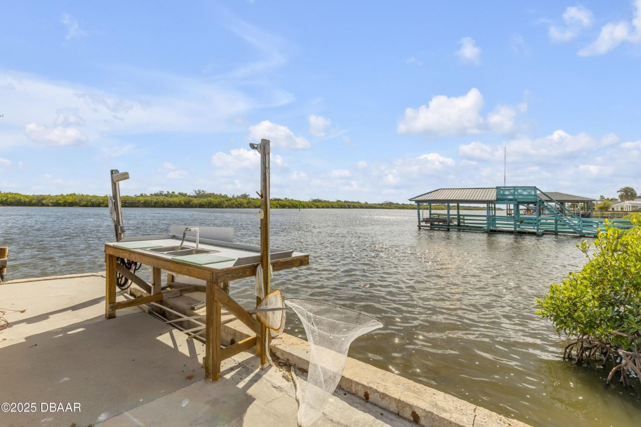 Discover coastal comfort in this Well-Maintained 2-bedroom/2-bath home in a 55+ waterfront community. This home features luxury vinyl plank flooring in the kitchen, bathrooms, and laundry room, shingle roof year 2021, cathedral ceilings, A/C year 2022, and updated stainless steel kitchen appliances, over-the-range stainless microwave, sleek French-door refrigerator, a stainless double sink with pull-down faucet sprayer, and a Reverse Osmosis water filtration system. Custom plantation blinds are hung throughout. A floodlight with smart camera lights for the back yard. A generous storage shed with electricity was just added to the back yard to store your tools, hobbies, or gear. Located just minutes to New Smyrna Beach. The Friendly Shores community boasts direct water access for fishing or boating, a community center with outdoor seating, a large fishing dock, kayak launch, and low HOA fees that cover water, sewer, trash, and common areas.