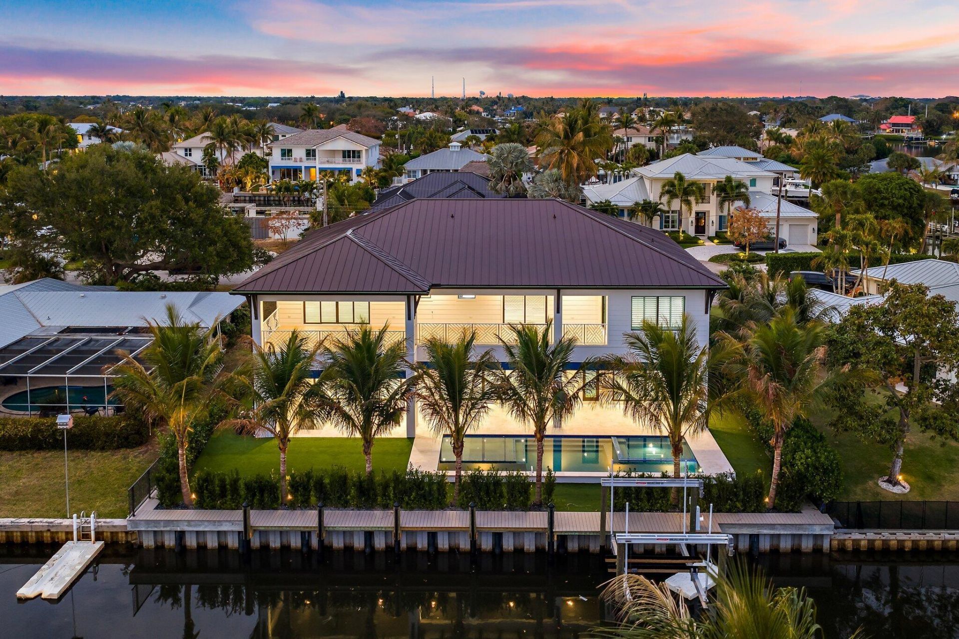 Newly completed in February of 2026, this waterfront estate home has it all. The main floor boasts a custom built-in aquarium in the great room; chefs kitchen with Sub-Zero and Wolf appliances and two islands, plus prep. Kitchen; home theatre room; three car garage (one bay is turned into a fitness center); powder room; and first floor guest suite. Wide plank oak floors throughout the main core of the home provide warmth and charm. The 2nd floor features an elevator; primary suite with two closets and huge primary bath; loft area with bar; two guest suites; and a large, covered balcony. The outdoor spaces feature custom pool with spa and water features; summer kitchen with BBQ; artificial turf back yard, and new dock with boat lift. All constructed with the finest materials and craftsmanship. Located just steps from the Tequesta Country Club, this deep-water estate home truly exceeds the expectations of the most discerning buyers.