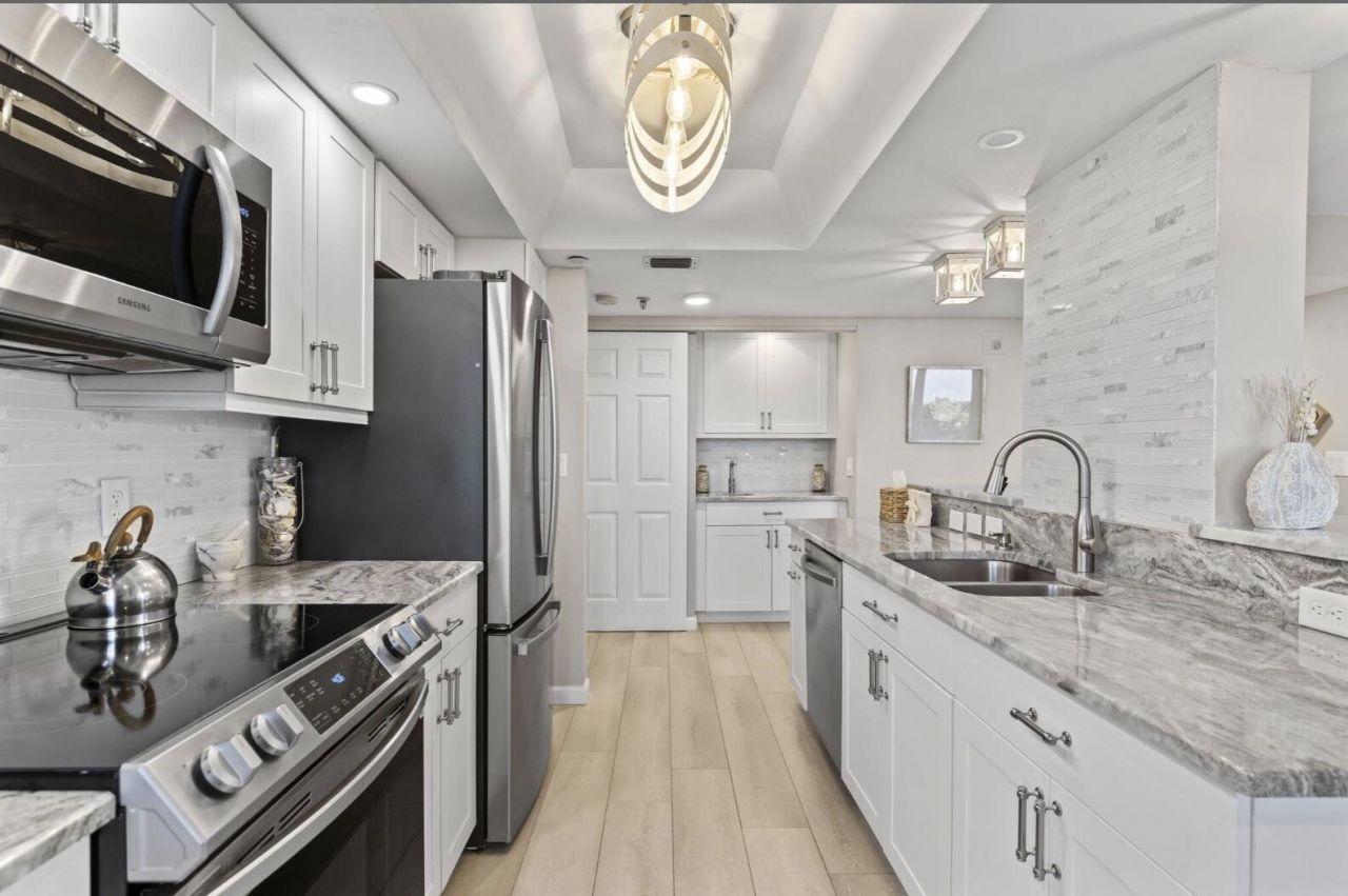 Stunning corner condo with ocean views from every window. This completely renovated, 2br/2ba condo shows like a model home. It's being sold turn-key w/ all designer furniture & decor included. Kitchen has been completely transformed & opened to the living area. Upgrades include new stainless appliances, cabinetry, top tier granite, fixtures, luxury wide-plank laminate flooring, water heater, new electric panel/wiring, and renovated baths. No stone has been left unturned. It comes with a one-car garage & shared storage closet. Only 4 units per floor. All of this in the wonderful, resort-like community of Ocean Village. Enjoy the manicured 9-hole golf course, walking to private beaches, socializing in the multiple clubrooms & pools, eating in the beachside restaurant, playing tennis, pickleball, bocci ball, basketball and more! Seascape has private pool as well & close to beach access. Great rental income (minimum 30 day rental).