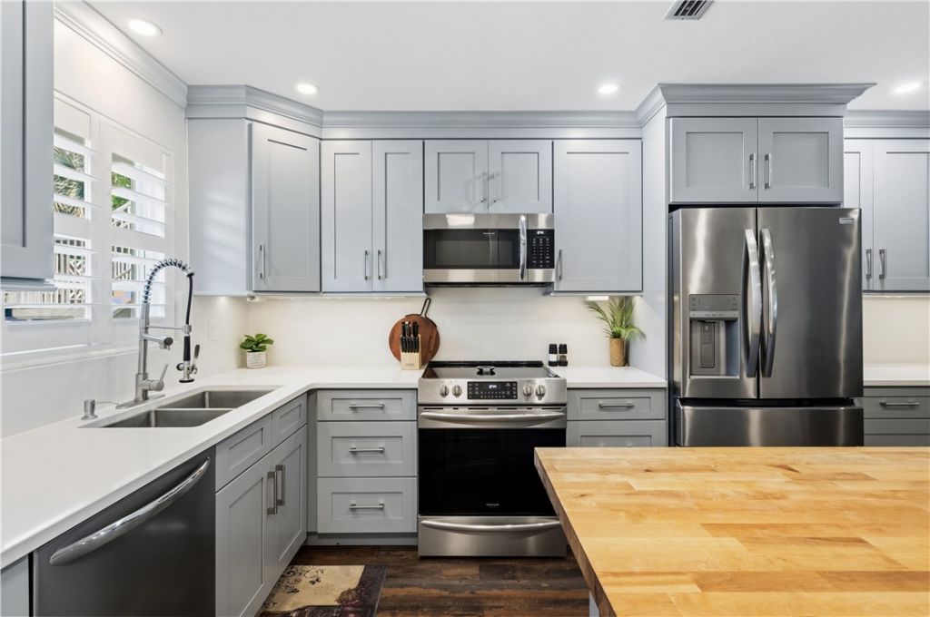 Lock the door and leave the lawn behind! This fully renovated, turnkey 2/2 condo at Vista Harbor delivers the low-maintenance Vero Beach life. Furnished and move-in ready with plantation shutters, impact glass windows and doors, crown molding and tile plank floors throughout. Split-bedroom layout with quartz-counter baths and walk-in showers. The kitchen earns a double take: quartz counters, SS appliances, light gray shaker cabinetry, butcher block island, and wine cooler. Enjoy the screened sun porch and river proximity. 55+ community with pool, clubhouse, shuffleboard, and assigned parking.