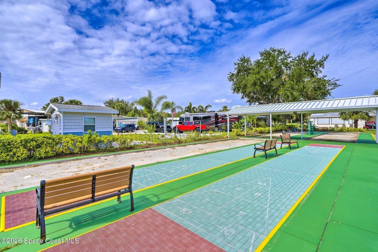 RV Resort living at this active 55+ community for year round or seasonal use. This lot will accommodate any size or style RV with extra large concrete pad and hookups for water, sewer, electricity and cable. A large, wide RV Port 24 7 x 42 was added in 2024. It will cover your RV, your vehicle and your toys! There is a gated entry and and an executive golf course on the property. Amenities include a clubhouse, heated pool, tennis, pickleball, shuffleboard, bocce and tennis. The community is close to airports, theme parks, beaches, shopping and restaurants. Watch the rocket launches from your own yard. The inexpensive association dues cover deluxe cable, your own internet modem/router, sewer, water, trash removal, lawn care and access to common areas.
