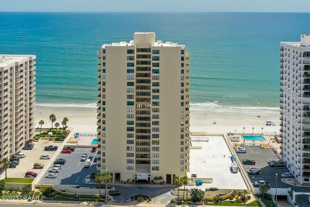 What a view of the East to the ocean, North to the Halifax river, and your sunsets West. Required maintenance near completion. Corner unit with split floor plan. Sliding glass door in both the living room and primary bedroom. 21 Floors with 6 condos per floor. Balcony Washer/Dryer (free) and a locker provided for your soap supplies. Start your vacation right after closing - the unit comes furnished. Water and basic cable are included (Spectrum). Sliding glass doors in both living room and primary bedroom with roller shades, put push a button. Enjoy access to balconies featuring stunning views of picturesque sunsets over the river and views of sunrises over the ocean from this sky home. Pet friendly building, limitations apply. Take a look