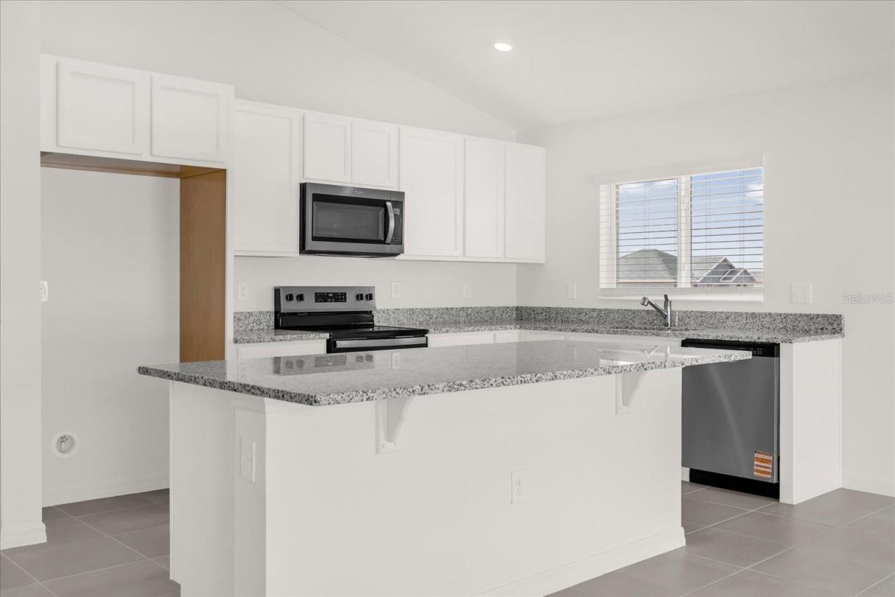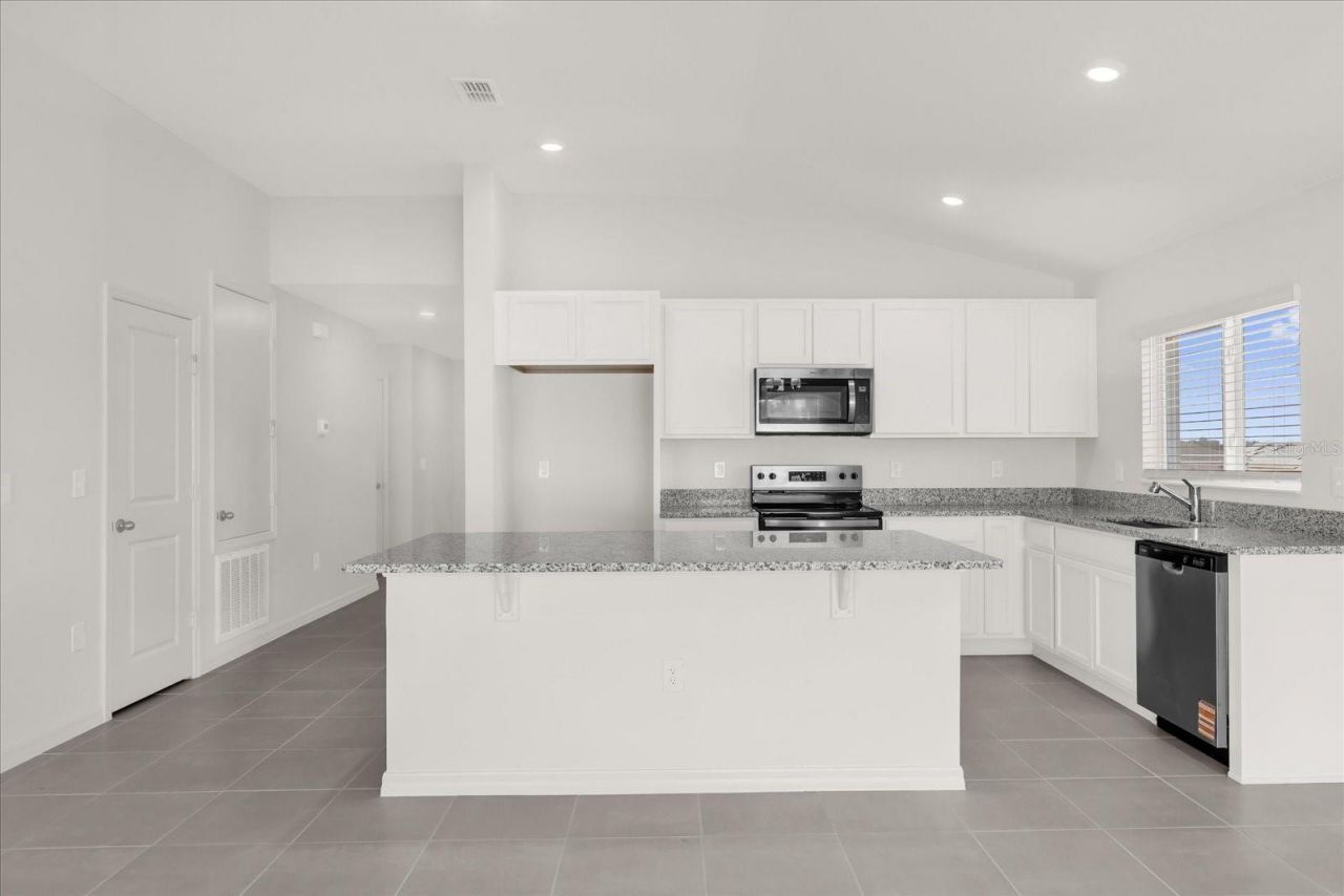 Built by a leading new home builder in Orlando, Florida, this charming single-story home features an open floor plan with sleek tile flooring and soaring volume ceilings in the spacious great room, ideal for everyday living and entertaining. The thoughtfully designed kitchen offers granite countertops, a center island, 36-in. upper cabinets, Moen faucet, Kohler stainless steel sink, and Whirlpool stainless steel appliances. The private primary suite provides a relaxing retreat with plush carpeting, a walk-in closet, and a well-appointed bath featuring a dual-sink vanity, linen closet, and walk-in shower with tile surround. Enjoy outdoor living on the peaceful covered back patio, perfect for gatherings or quiet evenings, making this home a standout among new construction homes in the Orlando area.