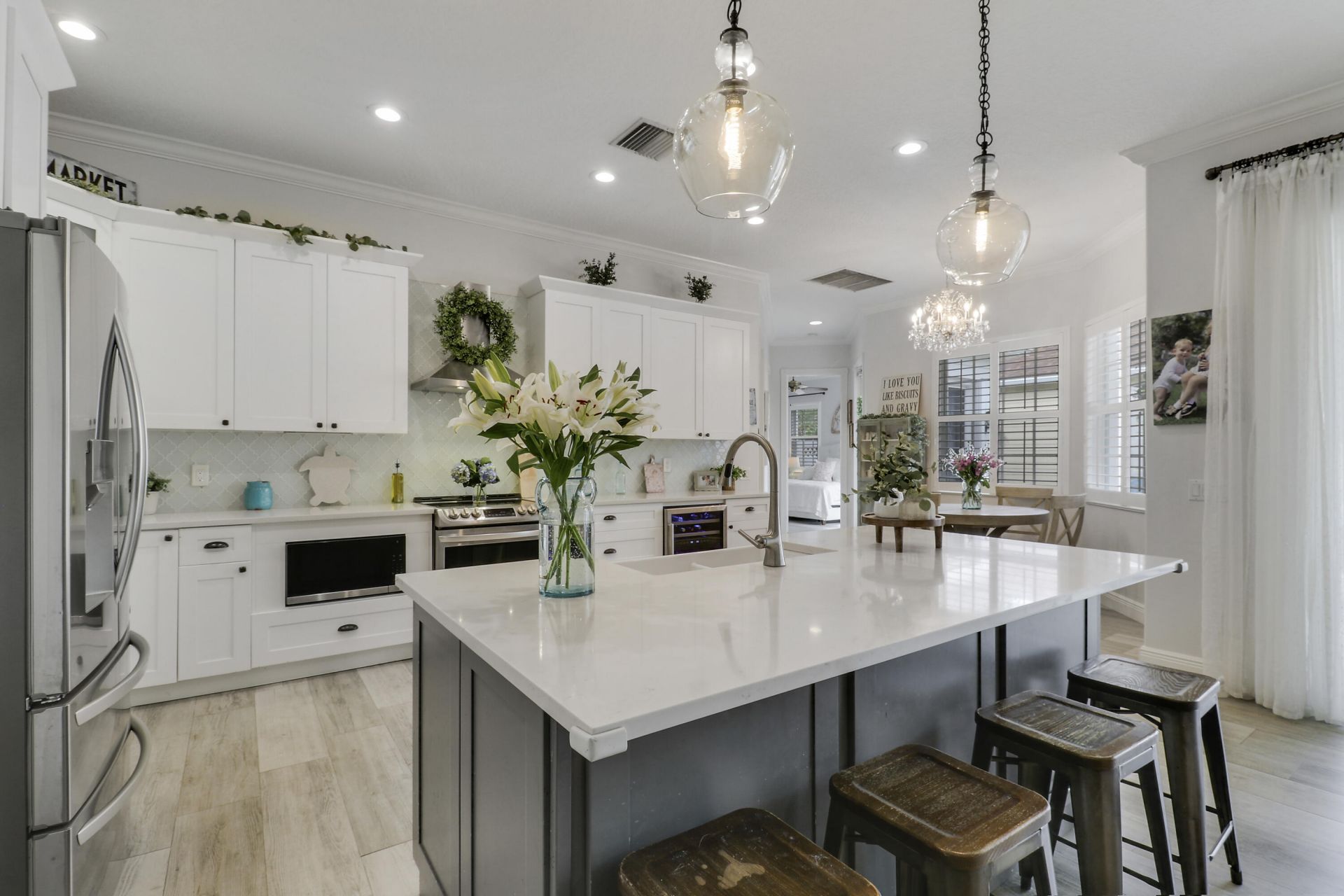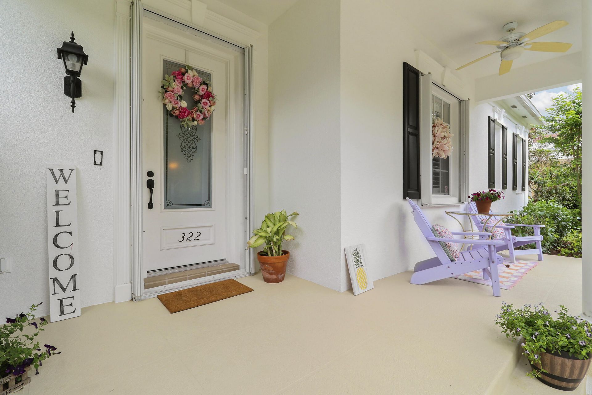 Bright, inviting, and ideally situated, this courtyard-style B-Model home in NewHaven at Abacoa-built by Divosta Homes in 1999-offers 3 bedrooms, 2.5 baths, and a 2-car garage, along with tranquil preserve views from its charming front porch. Inside, a thoughtfully designed open-concept layout features tile flooring throughout, plantation shutters, and a beautifully renovated kitchen that has been opened up to enhance flow and functionality. The kitchen includes a center island, quartz countertops, upgraded appliances, modern lighting, and a sleek glass backsplash. The spacious living area is perfectly suited for both entertaining and everyday living. The primary suite offers a true retreat, complete with a spa-like bathroom featuring quartz countertops and dual shower heads with handhelds & body sprayers for a luxurious experience. Step outside to a private side yard designed for low-maintenance enjoyment, featuring artificial turf and a fun mini putting green-ideal for relaxing or casual play. Recent updates: roof replaced in 2022, 4-ton A/C unit replaced in 2021 and primary bathroom remodeled in 2025, providing added comfort and peace of mind. NewHaven is widely regarded as one of the premier neighborhoods in Jupiter, consisting of 405 single-family homes and 100 townhomes, and offering a true sense of community. Residents enjoy a well-maintained environment with HOA benefits that include exterior painting (completed in 2025), cable TV and high-speed internet through Hotwire, exterior pest control, and landscaping. Community amenities include two pools with heaters for the winter months and chillers to keep them refreshing in the summer, a brand-new fitness center, 2 playgrounds for the kids, clubhouses, scenic walking trails, and a newly added covered park. All just minutes from pristine beaches, top-rated schools, golf, shopping, dining, downtown Abacoa, and Palm Beach International Airport.