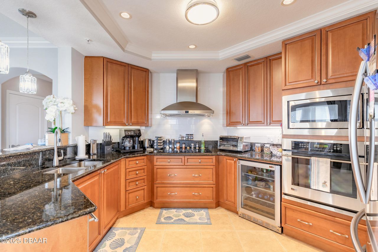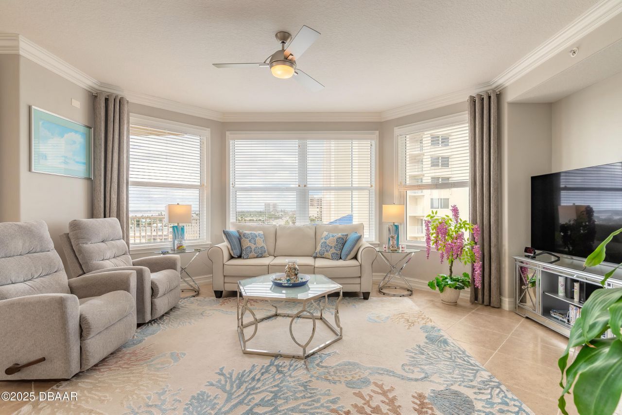 Experience elevated oceanfront living in this beautifully updated 3-bedroom, 2-bath residence at Marbella, a boutique building known for privacy and understated luxury in Daytona Beach Shores. Perched on the 5th floor, this 1,925 sq. ft. condo delivers breathtaking, panoramic views stretching from the Atlantic Ocean to the Halifax River"and on clear nights, even Cape Canaveral rocket launches lighting up the horizon.Designed to embrace indoor-outdoor living, the home features two private balconies. The expansive west-facing balcony is ideal for entertaining or quiet evenings, complete with multiple sliding glass doors and a built-in electric grill"perfect for taking in both glowing sunsets and tranquil water views. A second south-facing balcony connects the guest bedrooms, filling the space with natural light and offering an additional private retreat. Inside, the open-concept layout feels bright and refined with 8½-foot ceilings, crown molding, and a blend of tile and wood-look flooring throughout. A newly installed, sleek electric fireplace adds both ambiance and convenience and can be controlled remotely via smartphone from anywherewhether you're home or away.The dining area is thoughtfully positioned to keep water views front and center, creating a stunning backdrop for everyday meals or special gatherings. The gourmet kitchen is equally impressive, featuring stainless steel appliances, granite countertops, 42-inch upper cabinetry, a built-in wine cooler, and a five-burner electric cooktop with a stainless steel hood, ideal for both casual cooking and entertaining.Whether you're starting your mornings with ocean sunrises or winding down as the river reflects the evening sky, this home offers a daily connection to the water that never gets old. From the expansive balconies to the light-filled interior, every detail is designed to elevate coastal living in an intimate oceanfront setting along Daytona Beach Shores.