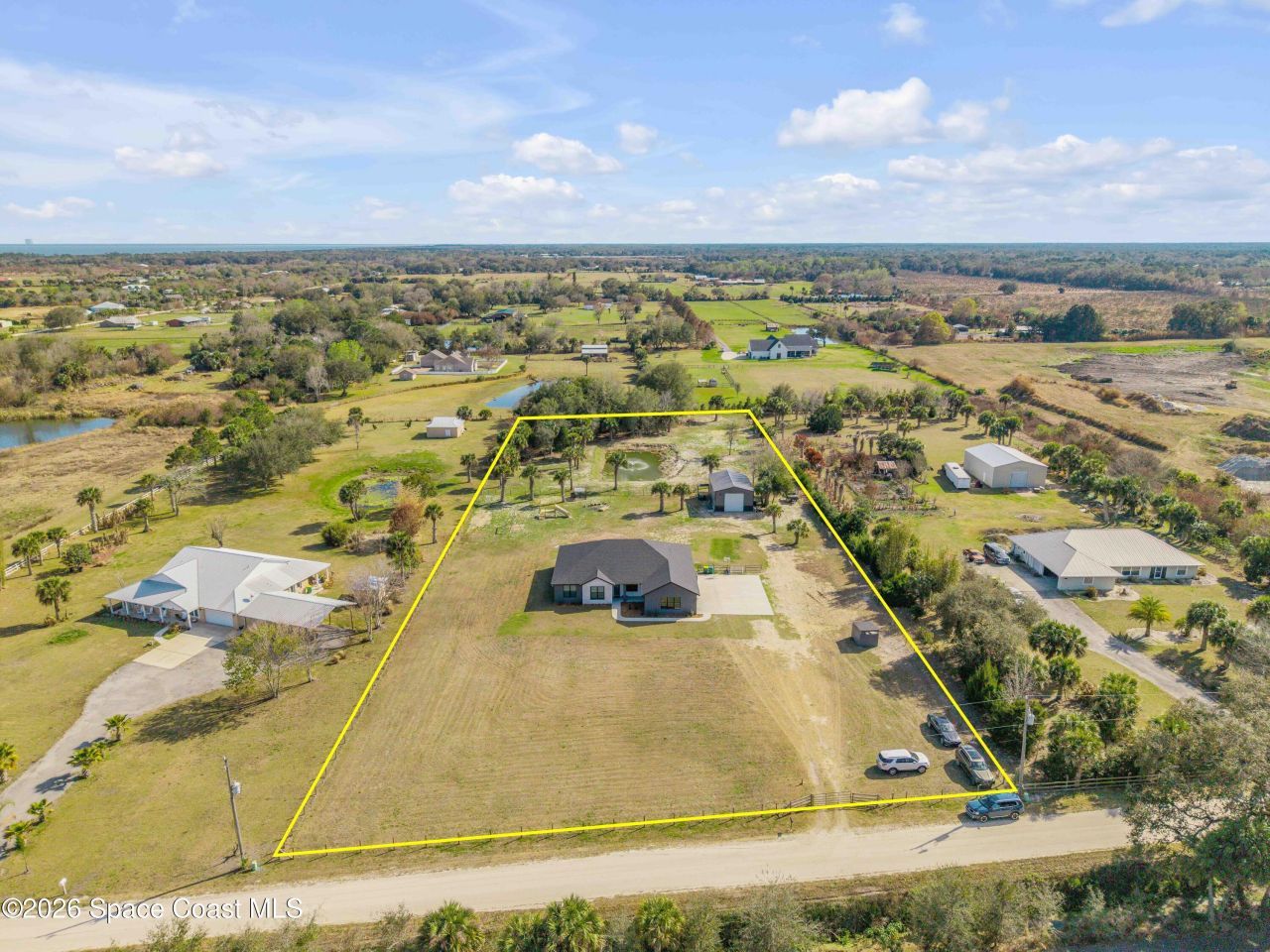 Discover luxury and space on this stunning 5-bedroom, 3-bathroom home in Mims, Florida. Built in 2024, this 2,340 sq. ft. residence sits on 3 private acres featuring a serene pond, gated entry to the property, a 3-car garage with ample cleared land for outdoor enjoyment and, a 23 ft x 39 ft detached garage/workshop. Inside, modern tile flooring and cathedral ceiling highlight an open floorplan. The living room features an electric fireplace and a 3-panel sliding glass door that opens to the outdoors. The chefs kitchen impresses with stainless steel appliances, a striking backsplash, a statement range hood, and a walk-in pantry with extra counter space perfect for a coffee bar. The primary suite offers tray ceilings, dual sinks, a walk-in shower, and a spacious closet. Outdoors, the expansive yard invites relaxation and entertaining. Tucked away on a quiet dead-end road, this property provides privacy while remaining minutes from highways and the coast.
