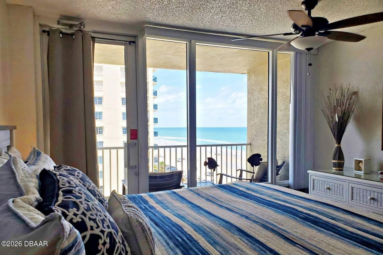Experience coastal living at its best in this beautifully remodeled oceanfront condo in the iconic Pirates Cove, Daytona Beach Shores. Enjoy spectacular panoramic views of the Atlantic Ocean and Intracoastal Waterway from your private balcony " perfect for sunrise coffee and breezy seaside evenings. This charming unit lives large with a king-size bed, trundle sleeper sofa, and open layout designed for comfort or vacation living. The well-appointed kitchen includes a full-size refrigerator, oven/stove, microwave, and essentials for easy meal prep. A spa-style bathroom with a walk-in pebble-stone shower adds a luxurious touch.Ideal for personal enjoyment, seasonal escapes, or short-term rental income. This property allows no-minimum rentals, offering flexibility for seasonal stays. Owners may self-manage or use a rental service of choice, and the unit is fully equipped and turnkey. The condo holds a strong rental history, and all assessments have been paid by the seller. Community amenities and outdoor spaces are being refreshed with planned reopenings. HOA fees cover utilities and exterior maintenance for low-maintenance ownership. Live minutes from local restaurants, and the Daytona Beach Pier/Boardwalk. Spend your days exploring nearby gems like Ponce Inlet Lighthouse, Speedway, the Space Coast launches, and the peaceful blue-water springs, with Orlando's world-famous theme parks and historic St. Augustine only an easy day trip away. This is the quintessential Florida beach lifestyle a fully turnkey oceanfront retreat you won't want to miss!