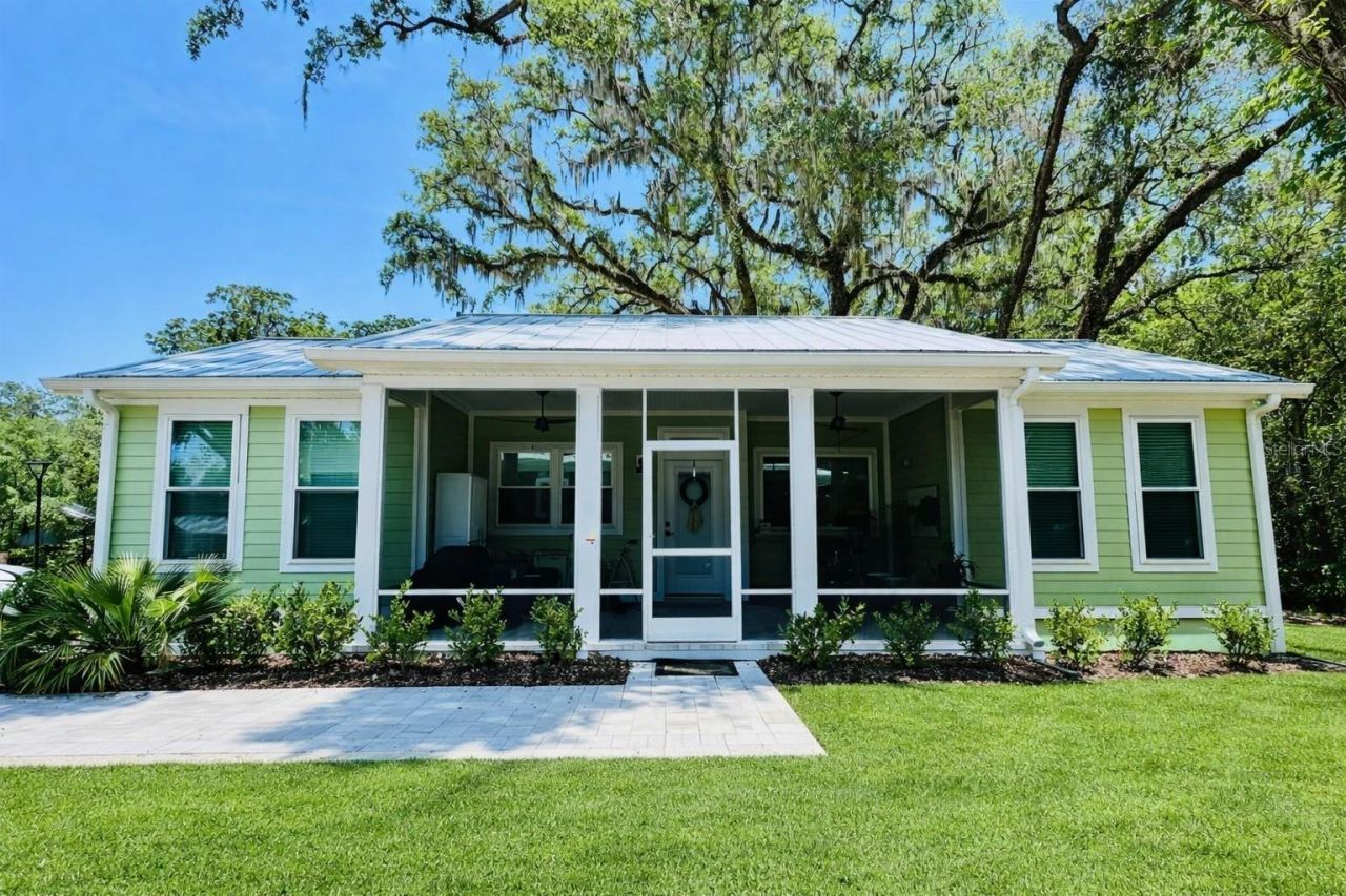 Charming 2-bedroom, 2-bathroom home located just outside The Villages in a vibrant all-ages, land-leased community. This cheerful tropical gem features a metal roof and eye-catching green exterior, paired with energy-efficient mini split A/C and stainless steel kitchen appliances for modern comfort. Enjoy the spacious screened-in porch complete with a pass-through window from the kitchen-perfect for entertaining or relaxing with a breeze. Inside, you'll find a clever hidden cabinet with three pull-out drawers at the kitchen bar, plus an indoor laundry area with stackable washer and dryer. A two-car pavered driveway provides plenty of parking. The community offers resort-style amenities including a pool, clubhouse, fitness center, pickleball court, dog park, community garden, walking paths, EV charging stations, and a monthly calendar full of activities and events. Lawn care and basic cable are included in the fees. Conveniently located near shopping, dining, I-75 and the Turnpike-this is Florida living at its finest!