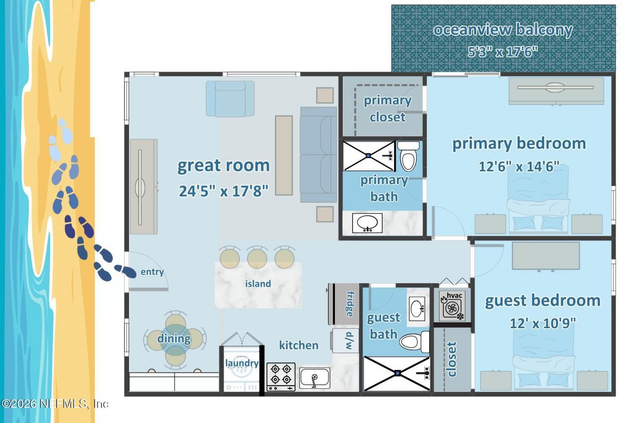 This stunning 2-bed, 2-bath ocean view condo was taken down to the studs and meticulously rebuilt from the inside out. With nearly 1000 sq ft, this unique and open floorplan is located in Beachcomber II, a boutique-style oceanfront building with only twelve homes. It's got that small-building charm without any of the cookie-cutter vibes. Whether searching for your primary, 2nd home or investment opportunity - this beach place checks all the boxes. Unlike most other oceanfront condominiums, short-term rentals are allowed. Bring along the furry family members - pets are welcome too!Step inside and be wowed by the completely open and gorgeous living space. The thoughtfully appointed kitchen showcases bright white soft-close shaker cabinetry and ''Fantasy Ivory'' granite counters accented with a travertine backsplash. The KitchenAid induction range with dual ovens pairs nicely with the counter-depth Samsung French Door fridge. The living and dining areas feature impact-rated hurricane-compliant windows with wifi enabled remote-controlled privacy roller shades. This beautiful space is accented with a striking stone-stacked tiled accent wall. The dining area features custom built-ins - just perfect for storage and display.The oversized primary bedroom offers a large walk-in closet with custom built-ins, blackout blinds, and a private ocean view balcony accessed through impact-rated sliding doors. The ensuite bath boasts an oversized shower with strikingly handsome wall tile accented with a tiled waterfall and pebble-floor. The Carrera quartz counters top the Wellborn Forest soft-close cabinetry. The spacious guest bedroom is currently used as an office and fitness room. It also has custom closet built-ins. The guest bath impresses with a rare and exquisite onyx counter featuring LED under-glow. The oversized shower is completely tiled including the ceiling and is accented with a stylish European sliding glass shower door.Upgrades run deep here -- soundproof drywall, replaced main electrical panel, a tankless water heater, and a water softener/purification system. The HVAC was replaced last year. Laundry day is a breeze with the built-in LG full-sized stacked washer & dryer. Water & Sewer are included in the monthly fees. Take a splash and hangout in the recently refurbished oceanfront pool with adjacent picnic pavilion and deck. The building was recently water-proofed, re-sealed and painted. Easy living with two covered, dedicated parking spaces conveniently located at the base of the stairs to the condominium. Just four blocks to vibrant downtown, next to JAX Beach Oceanfront Park and across from UNF Beach Sculpture Park - you and your vacation guests will love it all!