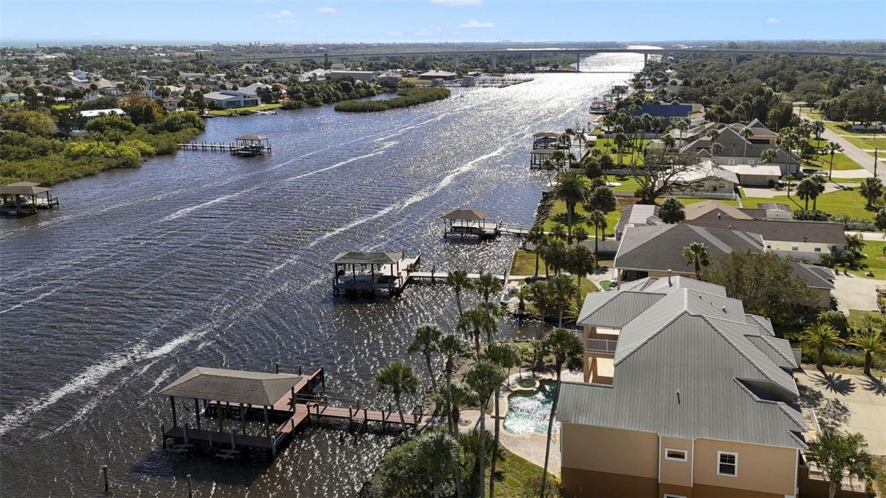 Welcome to this exquisite Intracoastal Waterway estate, a true tropical paradise offering luxury, privacy, and breathtaking views in the heart of Flagler Beach. Surrounded by lush, manicured landscaping, this six-bedroom, four full and two half-bath home showcases stunning architectural details and elegant craftsmanship throughout. As you enter through the grand double glass doors, you are greeted by panoramic views of the Intracoastal, soaring ceilings, and an abundance of natural light pouring through the massive windows and sliders. The bamboo wood flooring, decorative niches, fireplace, and exquisite crown molding create a warm atmosphere. The main level features a formal dining room, open living area, spacious breakfast nook, and three bedrooms with two and a half baths, perfect for family or guests. The gourmet kitchen is a chef's dream, featuring granite countertops, custom wood cabinetry, a center island, and stainless steel appliances.The master suite, located on the private third floor, offers a peaceful retreat with its own balcony overlooking the water, fireplace, large walk-in closet with washer and dryer, and a luxurious spa-like bath complete with dual granite vanities, walk-in shower, and jacuzzi tub. The ground floor is designed for entertainment and comfort, boasting a large game room, two additional bedrooms, and an office. A three-car garage provides ample parking and storage space. Step outside and experience Florida living at its finest, with two balconies, a large lanai, and a pavered pool deck surrounding the sparkling pool and in-ground spa. Enjoy boating from your private dock with boat lift and slip accommodating up to a 12,000 lb vessel, 2 jet ski lifts and a spacious deck and seating area. Additional features include a metal roof and hurricane shutters for peace of mind. Nestled on a quiet street, this home offers easy access to the beach, parks, schools, bike paths, golf courses, shopping, and restaurants. This is more than just a home, it's a lifestyle of luxury and waterfront serenity. Call today to schedule your private showing.