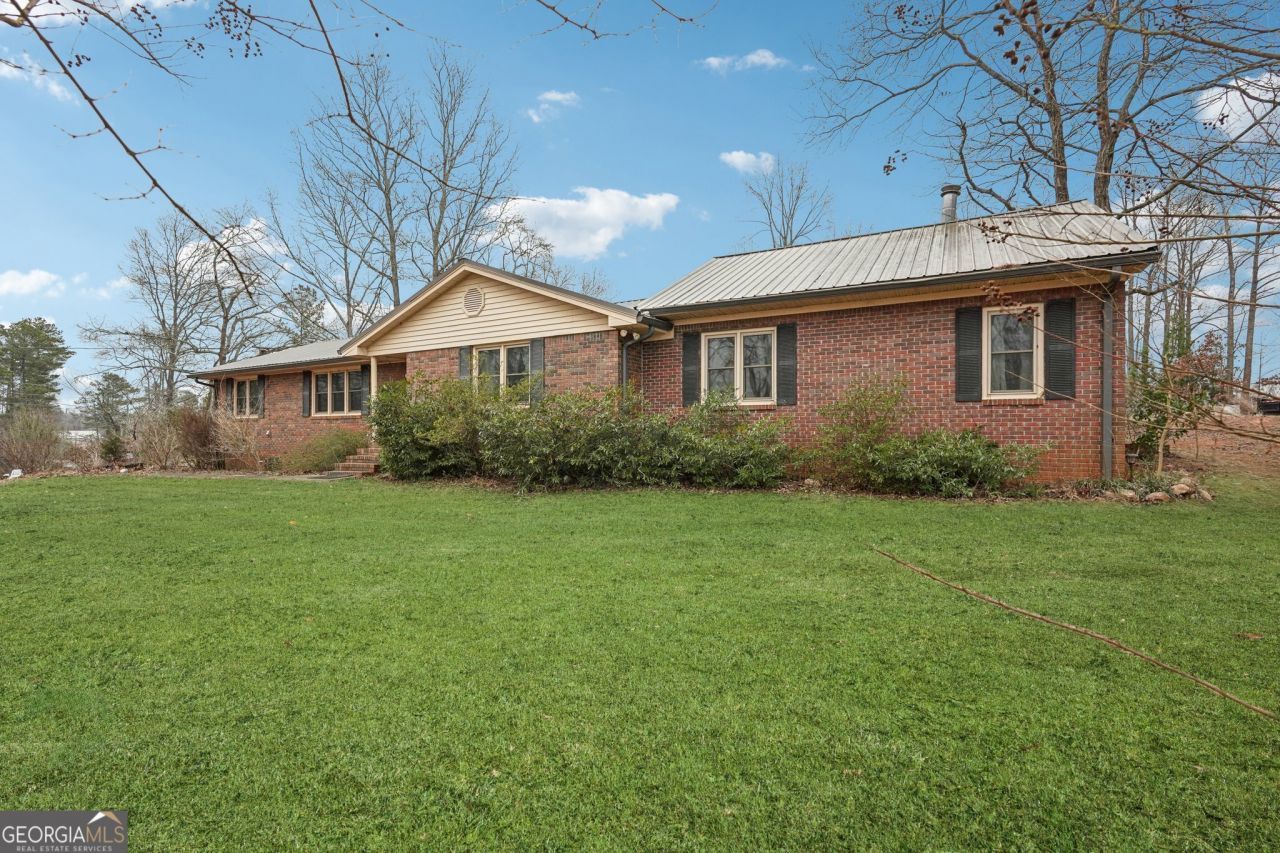 Opening weekend! Come see it before it's gone! Welcome home to this timeless four-sided brick ranch. Offering durability, charm, and space both inside and out. Situated on almost two private acres, this property delivers the perfect balance of comfort, function, and lifestyle. Step inside to beautiful wood floors flowing throughout the home and a thoughtfully updated kitchen featuring crisp white cabinetry and stainless steel appliances. Off the kitchen walk through french doors that lead to a formal dining space fit for the whole family. A large laundry room and convenient half bath add everyday practicality to this well-designed home. This spacious layout includes four generously sized bedrooms and two and a half bathrooms. The oversized primary suite is truly a retreat of its own, complete with a cozy fireplace, walk-in closet, and private glass door leading directly to the side yard. Imagine stepping outside with your morning coffee or winding down in the evening by the fire. This home offers two fireplaces, one anchoring the living room with warmth and character, and another creating an intimate atmosphere in the primary bedroom. Beyond the home, the property shines with rare and versatile outbuildings: * RV carport with electrical hookup * Large detached garage with electricity * Greenhouse for year-round growing * Dedicated man cave space * Plant potting station * Multiple functional work and hobby areas Whether you need storage, workspace, hobby areas, or room for recreational vehicles, this property delivers flexibility that is hard to find. Enjoy peaceful mornings and relaxing evenings on the porch overlooking your expansive lot. If you are looking for space, character, and unique amenities all wrapped in classic brick construction with a metal roof, this is the one.