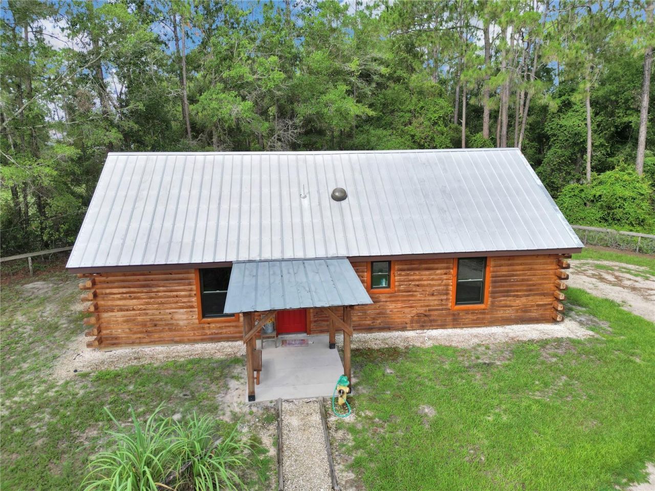 TURN the KEY, smell the CEDAR , SEE the natural light cast by skylights on the open floor plan. Half log inside & out & fully furnished & ready for you. This rustic cabin NESTLED in the Ocala National forest is perfect for you! Imagine sitting on the back porch enjoying the view of pond & natural forest right next door. CUSTOM built using Pine & Cedar & other wood in 2021, This energy efficient home has custom wood cabinets & unique detailing throughout the house. METAL ROOF, Water Heater, Central Air Conditioner all 2021. This home is a solid investment. Located in a secluded yet growing area. Not only will you gain equity, you can continue the current AirBNB bringing you INSTANT PASSIVE INCOME or enjoy personal use. Room with Washer/Dyer can easily be turned into a 2nd Bedroom/flex space. Gravel driveway- completely fenced wth gate so bring your DOG ! NO HOA NO FLOOD ZONE-- PAVED ROAD- NO RESTRICTIONS _ LOW hurricane impact area. ---VETERANS WELCOME!!!---3 5.7 miles away from shopping,. Marion county is home to Silver Springs , Silver Glen, Salt Springs & World Equestrian Center. There are well over 600 lakes making it easy to fish , hunt or play water sports. Give us a call. Lets make a deal!****FREE APPRAISAL - Credit at closing with preferred lender now until the 1st of April!