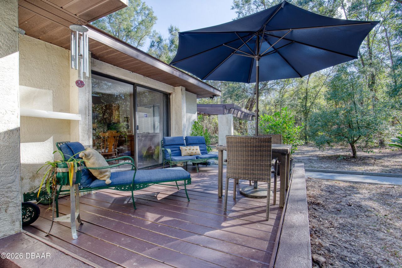 5669 Winona Trail | DeLeon Springs, FLSituated on 2.5 acres, this well-maintained property offers privacy, space, and a functional layout in a quiet DeLeon Springs setting. The home features 2 bedrooms, 2 full bathrooms, a oversized 2-car garage, and an additional carport, with ample room both inside and out.Just past the foyer, you're welcomed into the living room, which features a wood-burning fireplace. The spacious kitchen and dining area provide a practical layout and include a glass sliding door leading out to the front porch, allowing for natural light and easy outdoor access.The home offers a split floor plan, with both bedrooms featuring en-suite bathrooms. The primary suite includes a walk-in closet, dual vanities, a soaking tub, and a separate shower, along with a glass sliding door that opens to the enclosed Florida room. The second bedroom has its own private bathroom with access from both the bedroom and the hallway, making it ideal for guests. The enclosed Florida room provides flexible additional living space with large windows and natural light.Outside, the property includes a pump house located next to the carport, which also serves as a great workshop area. The expansive 2.5-acre lot offers plenty of space for parking, storage, and outdoor use, making this property well suited for those seeking room to spread out in a rural setting.