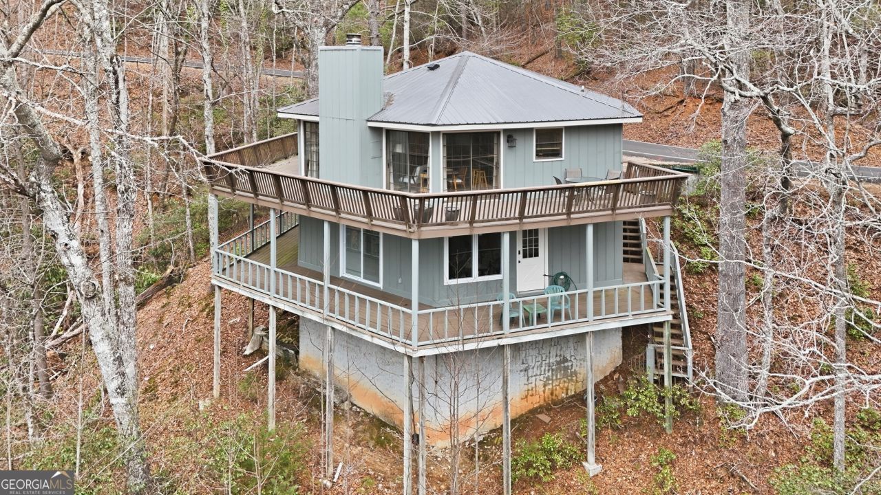 Spacious yet charming 2-story Octagon-style home in Sky Valley, GA, with 4 bedrooms and 3 full bathrooms, offering a private wooded view. The main floor features an open living room with a rock fireplace, a dining area, an eat-at bar in the kitchen, and ample seating to enjoy cozy moments by the fireplace. Additionally, it includes 2 bedrooms, 2 bathrooms, and a laundry room, all designed for comfort and convenience. The lower level has a kitchenette area, another living space with sofas, a dining area, a room for a game table, and space to spread out the kids or guests, plus 2 more bedrooms, another full bathroom, plus several closets. Each level has wrap-around decking, making it easy to find a relaxing spot to listen to the sound of Mudd Creek Falls flowing below the property. The community offers amenities with paid membership, like golf, swimming, tennis, and a private restaurant, creating a welcoming environment for leisure and socializing. This home may not be brand new, but it has plenty of charm, making it a wonderful family getaway or vacation rental. Comes mostly furnished, excluding a few personal items. Not required to join the Club to enjoy the natural setting, walking along the creeks, or use of the playground. Only 20 minutes to Highlands, NC.