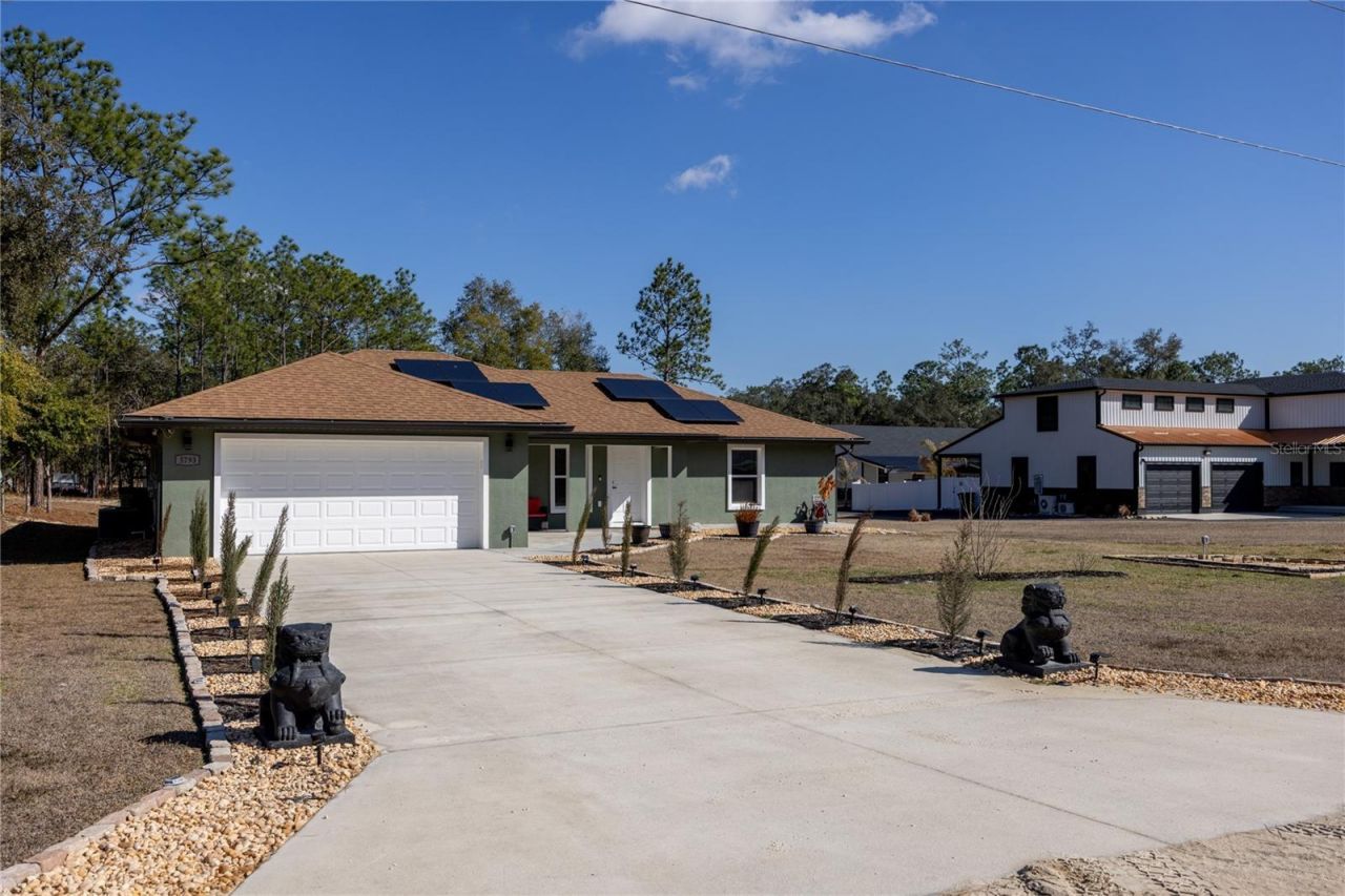 Welcome to this beautifully upgraded 3 bedroom 2 bathroom custom built home in the tranquil community of in Rolling Hills. Situated on a tree-lined street, this home features a beautifully manicured yard with mature landscaping on 1.61 acres. This residence offers the perfect blend of comfort, privacy, and convenience. Step inside to discover a thoughtfully designed layout featuring a spacious living room perfect for both relaxation and entertaining. Built in 2021 this home features many upgrades updates completed in 2024 to include: refreshed color palette on all interior walls and kitchen cabinets, granite countertops and elegant granite backsplash in kitchen, stainless steel Samsung appliances, quartzite countertops in bathrooms, porcelain tile in all living areas, light fixtures in master bath, kitchen, additional storage and modified existing cabinets to add more storage. Additional upgrades in 2022 include whole house solar panels (Momentum Solar), along with a complete water system attached to the well and into the home, and an extended cement slab in the back for entertaining (2025). The home features an efficient split floor plan with modern light fixtures that enhance its traditional charm. The home has ample storage space provided by plenty of cabinets and built-ins throughout. There is a dining room off the kitchen that looks out over the expansive backyard. The primary bedroom features a walk-in closet and an en-suite bathroom with a step-in shower and updated vanities with granite countertops. A laundry room off the 2-car garage with a newer Samsung washer and dryer. The open-concept floor plan seamlessly connects the cozy living area, kitchen, and dining area, making it great for everyday living and hosting. With its serene location, abundant space, and versatile layout, this home is a rare find in Ocala. Don't miss the opportunity to make it yours. This property can be subdivided to add another home on this 1.6 acre property. Excellent neighborhood in a great school district, conveniently located near hospitals, highways, and shopping centers. Located between Ocala and Dunnellon, only 15 minutes to Rainbow Springs and the beautiful Rainbow River for tubing, kayaking, swimming, and crystal clear spring water. Rolling Hills is surrounded by some of Ocala's premier one-of-a-kind equestrian estates and is only a few minutes from Ocala's World Equestrian Show Grounds.