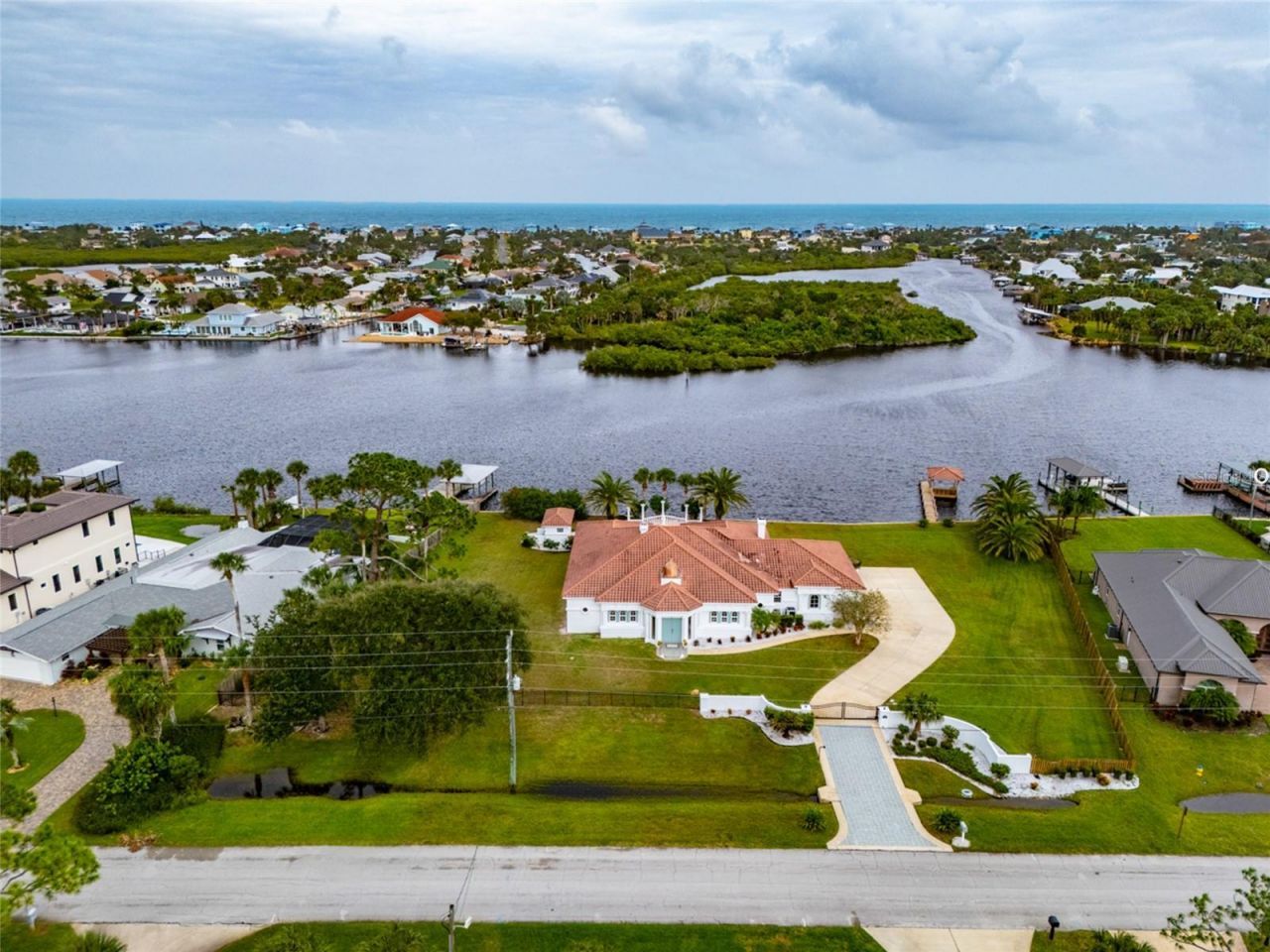 Rare Intracoastal estate on a triple lot! 660 Lambert Dr offers over 240 ft of direct ICW frontage -A RARE Intracoastal FIND! This Mediterranean-inspired residence features 3,476 sq ft living (5,431 total), a grand marble foyer, 2 fireplaces, gourmet kitchen with double ovens, 2 pantries with abundant storage, and a master suite with sunken tub, walk-in shower, cedar closet & built-ins. Additional highlights include 2 additional en-suite bedrooms plus a flex room, saltwater pool with fountains, detached pool bathroom cabana, newly refurbished dock, 3-car garage, freshly painted exterior, security system, and private gated entry. Tropically landscaped grounds with updated irrigation add to the appeal of this serene retreat. This one-of-a-kind Intracoastal estate offers timeless elegance, privacy and a front row seat to a vibrant coastal lifestyle.....All right at your doorstep.