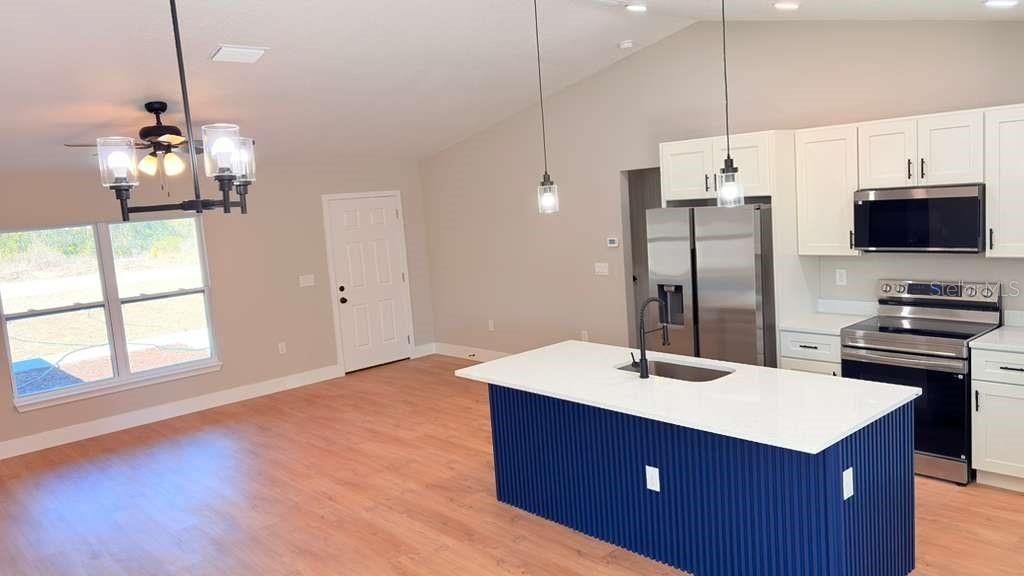 Stunning New Build in Ocklawaha - A Must-See! Discover this gorgeous, newly constructed home nestled in the serene setting of Ocklawaha. From the moment you arrive, you'll notice the thoughtfully placed spotlights that brighten all four corners of the property, adding both style and security. Step onto the inviting back porch, where a ceiling fan ensures your comfort as you relax outdoors. Inside, the open floor plan immediately impresses with its modern finishes and elegant design. The kitchen and bathrooms feature luxurious quartz countertops, while recessed lighting bathes the entire living area in a warm, welcoming glow. The kitchen is fully outfitted with essential appliances, including a dishwasher, refrigerator, stove, and microwave, ensuring this home is truly move-in ready. Enjoy the privacy of a split floor plan, with the spacious master suite thoughtfully separated from the guest bedrooms. The master bedroom is a true retreat, featuring a tray ceiling, a large walk-in closet, and an en-suite bathroom with upscale touches. On the guest side, the generously sized guest bedrooms are complemented by a well-appointed guest bathroom, offering comfort and convenience for family and visitors. Modern light fixtures and ceiling fans are thoughtfully placed throughout the home, enhancing every room with style and practicality. As an added bonus, Spectrum internet service is available, ensuring you stay connected in your new home. Don't miss your chance to own this beautiful property! Schedule your showing today and experience everything this home has to offer.