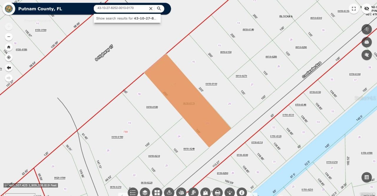 US Hwy 17 Property adjacent to CITGO station. 100' x 335' with 2 street frontage, front and back. If side setbacks 15 ft, then net 70 ft building for 3 to 4 stores. It is ideal for strip center for stores such Pizza, Subway, and various retail stores/offices. On 4-landed divided US Hwy 17, with multi purpose trail. Also has rear street access thus saving driveways. High and dry level property. AADT 12,000. Putnam County Parcel ID: 43-10-27-8252-0010-0170; Coordinators 29.584403, -81.612341