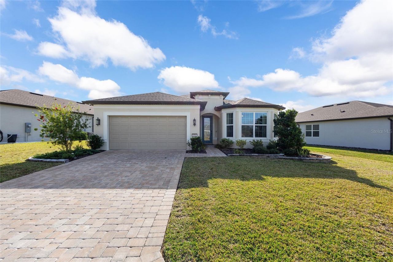 Welcome home to this meticulously upgraded residence located in the highly sought-after Stone Creek by Del Webb - Bridlewood neighborhood. Every detail has been thoughtfully selected, from the custom curb appeal to the high-tech interior features, making this a true standout property within the community. The home features smart home integration connecting the front door, garage door, security camera, and thermostat. Inside, durable luxury vinyl plank (LVP) flooring flows through the main living areas, complemented by upgraded carpet and padding in the bedrooms, modern LED lighting, and elegant 8-foot doors with 5 1/4-inch baseboards throughout. The gourmet kitchen is a chef's delight with stainless steel appliances, a wrapped kitchen island, and upgraded cabinets. The living room boasts tray ceilings and an incredible home theater surround sound system that extends to the screened porch. The flex room offers versatility with French doors, a tray ceiling, and pre-wiring for electric/cable. The primary bedroom is a luxurious retreat with a tray ceiling and a custom walk-in closet, and the primary bath features a luxurious walk-in shower. All bathrooms are finished with sophisticated 12x24 tiles and floor-to-ceiling shower/bathtub tile. The upgraded laundry room has cabinets and a walk-in storage closet, with a convenient mud room located between the laundry and the garage interior door. Infrastructure is top-notch, including an extended garage (10' x 15') with tandem golf cart parking, a hybrid water heater, water softener, and a full-house surge protector to protect major appliances (Note: EV charger does not convey). Outdoor enjoyment is maximized with a screened lanai featuring a sound system and fan with light, zero-corner doors, stone pavers in the driveway/walkway, full-house gutters with concrete downspouts, and the property is pre-wired for a future pool. This highly customized, move-in-ready smart home offers the perfect blend of luxury and community living. Stone Creek by Del Webb is a warm, active community united by its wealth of amenities and clubs, centered around the famous Terry Doss championship golf course. The amenities are truly second to none, featuring the brand new, state-of-the-art Waterstone clubhouse. This exquisite facility offers a social bar, a premium golf simulator, a modern outdoor fireplace, multiple event rooms, a large amphitheater for outdoor entertainment, bocce courts, billiards and large-screen televisions for sports viewing throughout.