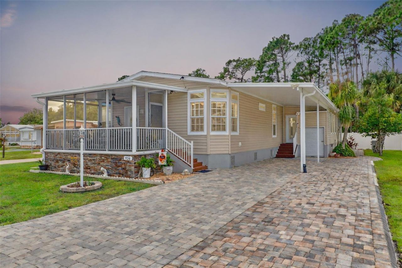 Welcome to Kove Estates.. Where do I begin with this HOME.. So many features, so little time..This 2018 Modular Home is over 2100sq Ft Under Heat and Air, on a Concrete Base Floor with tons of undercarriage storage. Building records state it is Category 3 Hurricane safe. This 3 Bedroom 2 Bathrooms homes has so much to desire. As you walk up you're greeted by a large screened in porch perfect for morning coffee and visiting with friends. As you enter you are welcomed with a Formal living area equipped with a Coffee/Wine wet Bar perfect for entertaining guest. Tons of natural light, Large Open Family Room overlooking a beautiful kitchen with cabinets galore, Large Kitchen Island, GinAir Cooktop with Exhaust, Newer Refrigerator 2024, Laundry Room with built in pantry storage, Recess lighting and desk area. Large Primary Suite with an on suite bathroom features dual sinks, walk-in shower, walk-in closet, lots of storage. Two additional bedrooms and full secondary bathroom. Large enclosed Sunroom perfect for additional living/storage area. This house also features a Full house Central Vacuum, Crown Molding throughout, extended Paver Driveway, Back Porch with Trek Deck overlooking Large Private Estate, Water Softener, House Generator and Lots of Storage, Newly Repainted Interior 2024 Newer Washer 2024. KOVE ESTATE is a 55+ CO-OP Community Resort Style Living at its finest, enjoy all the thrills without all the fuss. There is no lot rent, as a share in the community conveys with the sale. With a monthly cooperative fee of $270 which allows you to Enjoy Year Round 9 Hole Golf Course, 2 pools, one heated, tennis courts, pickle-ball, community events and the peaceful nights all in your very own gated community. Located just outside of Historical Sanford Fl. Sanford Airport is minutes away, Daytona Beach 40 minutes, Disney 45 Minutes away. The perfect spot to call home.