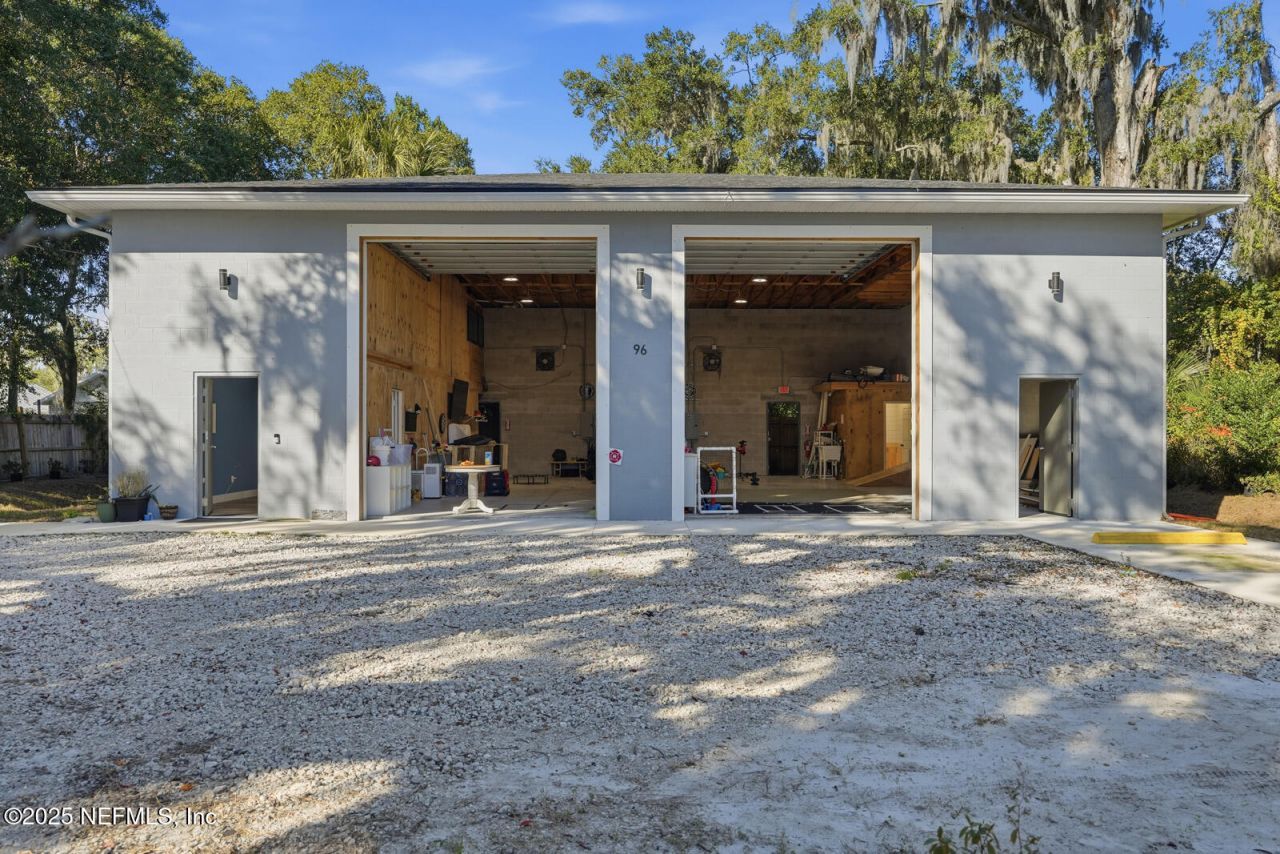 Introducing a brand-new 2025 block-constructed facility less than 10 minutes from downtown St. Augustine and under 15 minutes to I-95 - ideal for businesses looking for visibility and flexibility. The building features two large motorized roll-up bay doors, two separate entrances, and dual electrical meters allowing the space to be split into two independently serviced units. The main unit offers a ground-floor office, full kitchen and bathroom, plus a second-story office suite with its own bath. The secondary unit includes warehouse space with a convenient half bath. Additional amenities include a rolling entrance gate, well irrigation, and air conditioning via energy-efficient mini-split systems. Whether you're a growing business or investor, this turnkey asset delivers versatility, location, and professional grade build-quality in a thriving market.